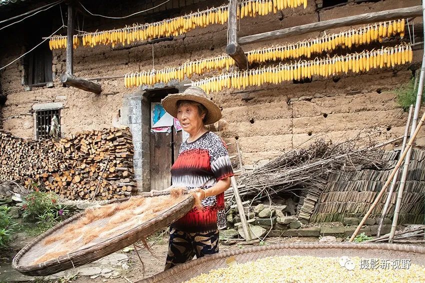 潘上湾村民组的一座老屋土墙上挂着金黄的玉米,大竹笸箩里晒着玉米籽和玉米缨。