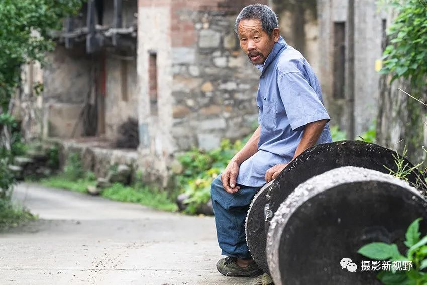 村里的老街道还保留着原始风貌,一位老人坐在大木头上歇息。