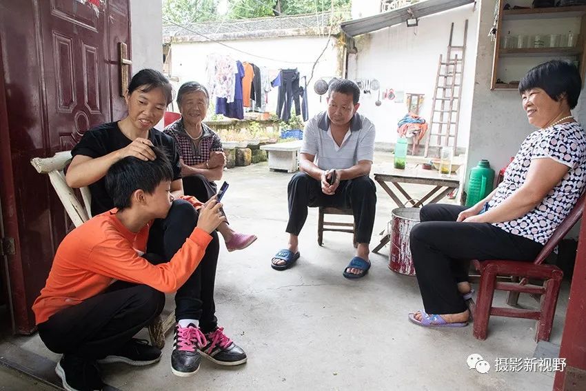 一家人坐在门楼下乘凉,儿子趴在妈妈腿上撒娇。