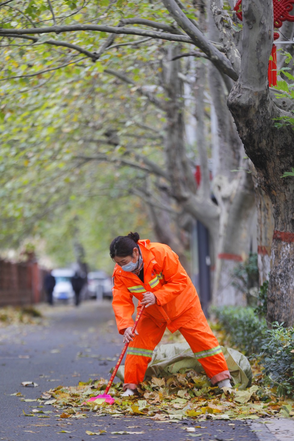 环卫工人崔慧英正在建设路上清扫落叶,她从凌晨三点本开始工作直到现在