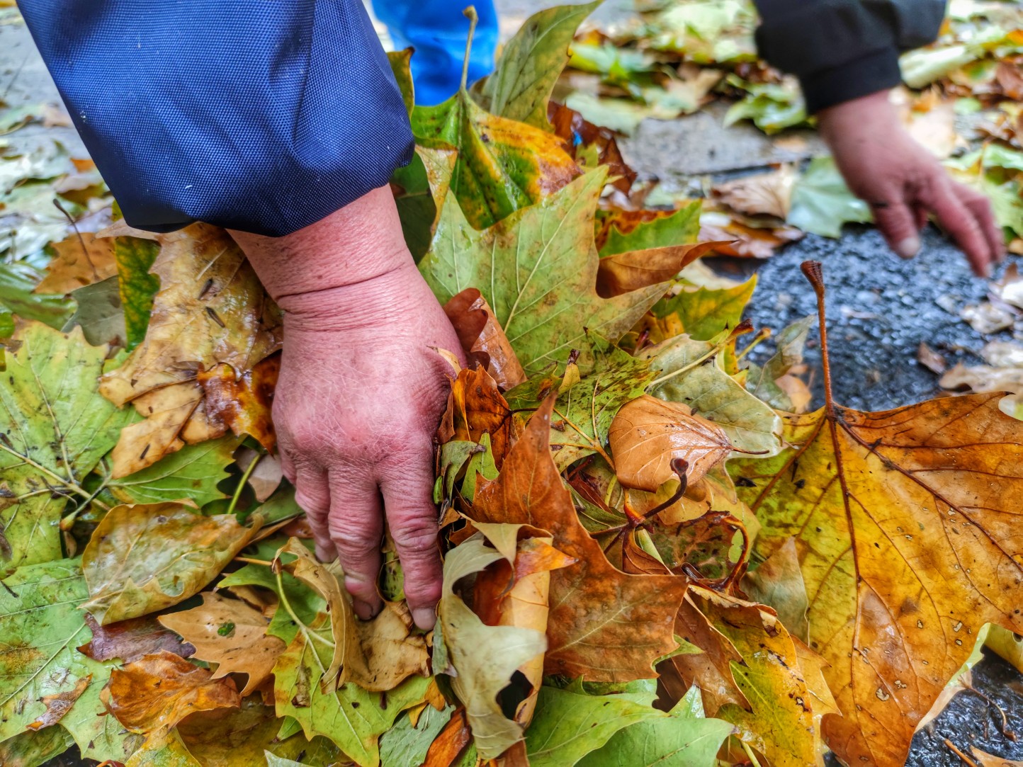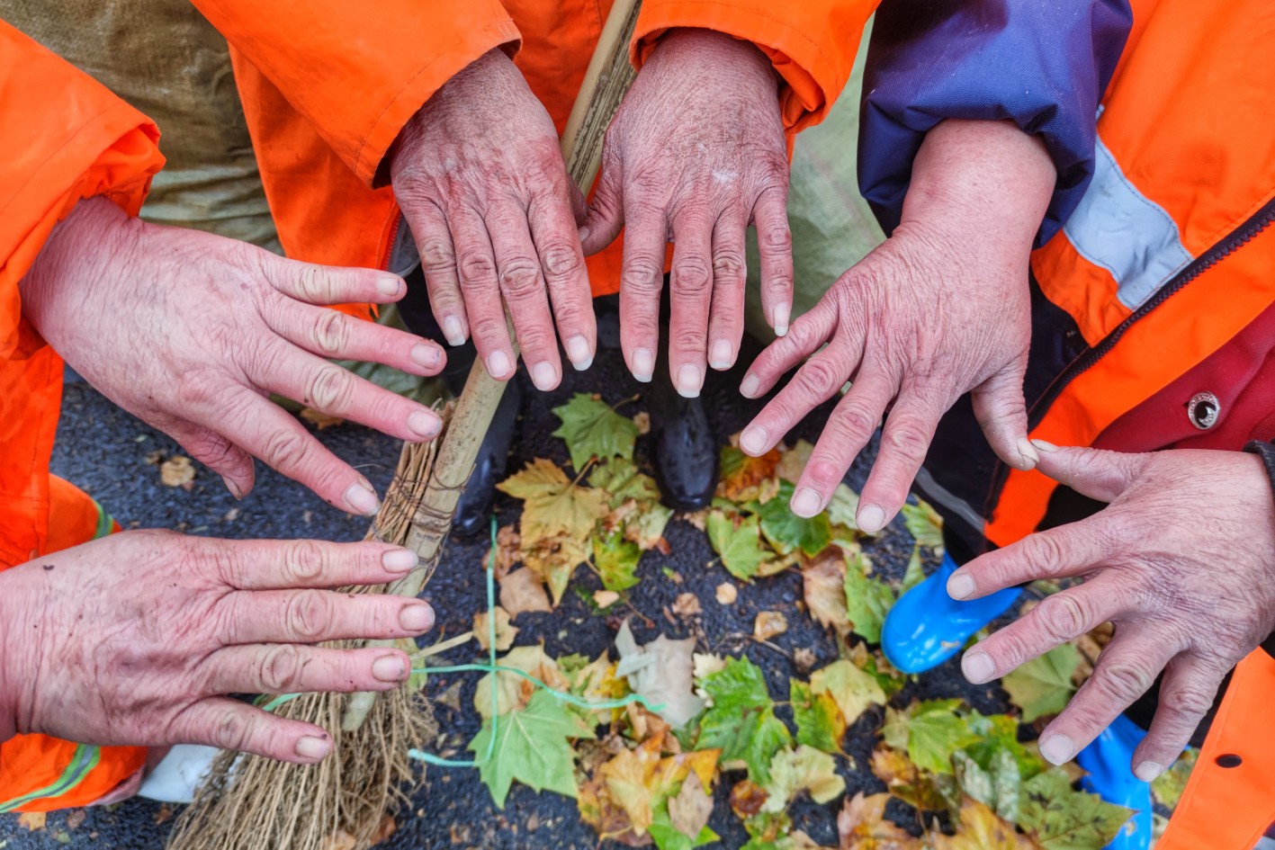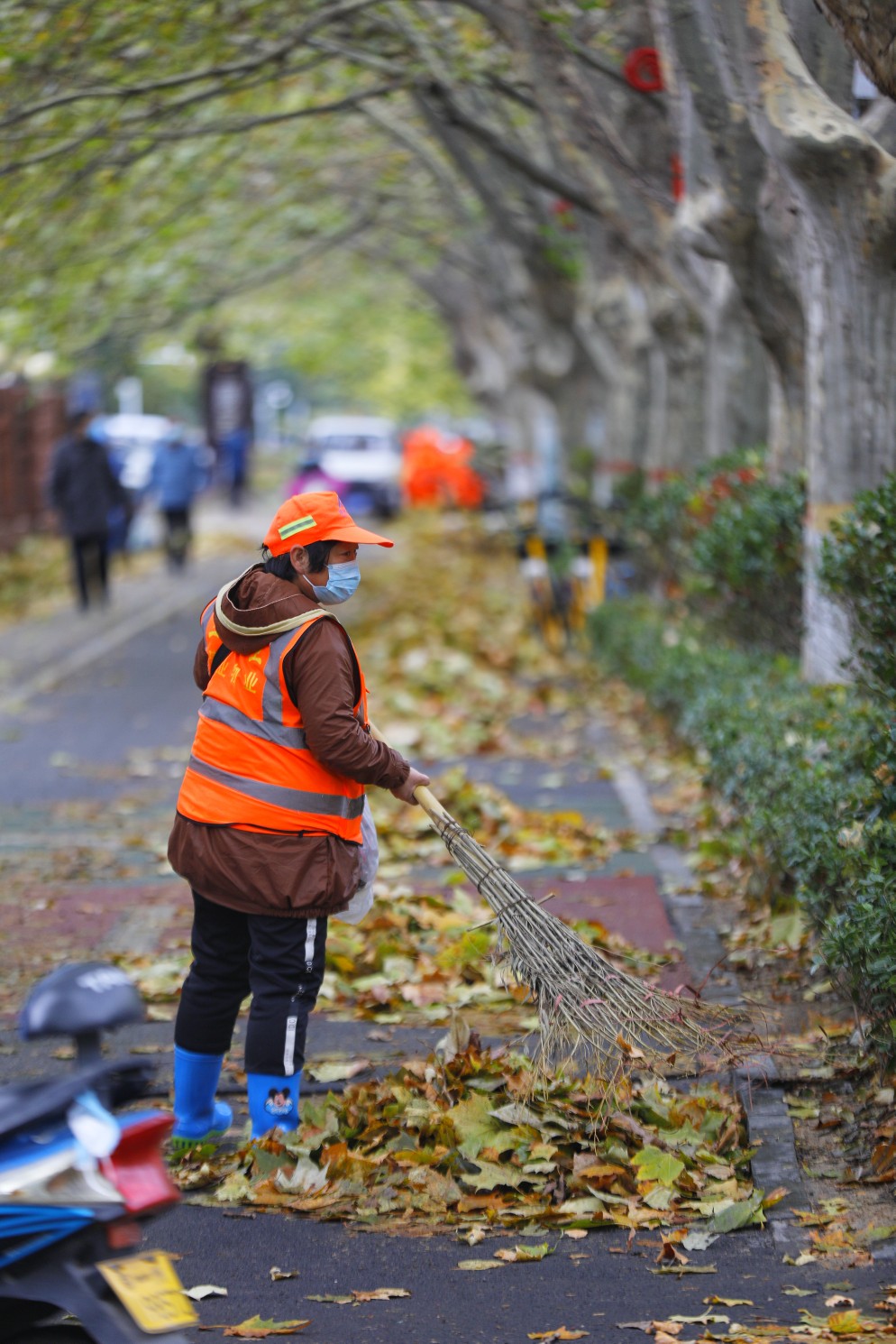 为了防止落叶被风吹走,环卫工人大多徒手清理湿漉漉的落叶