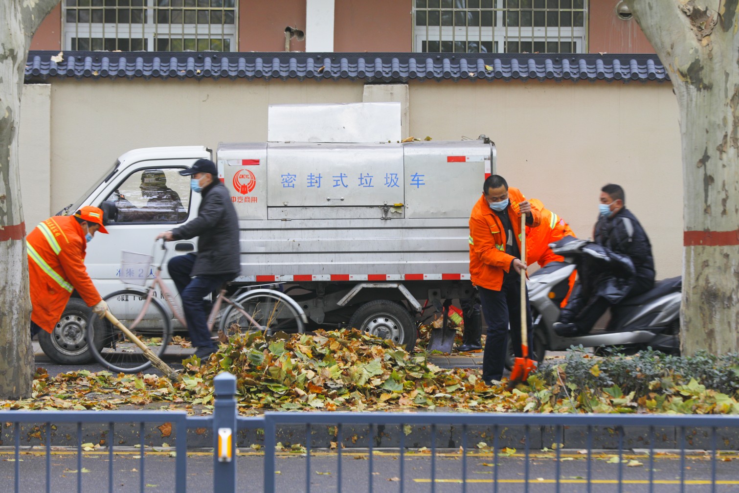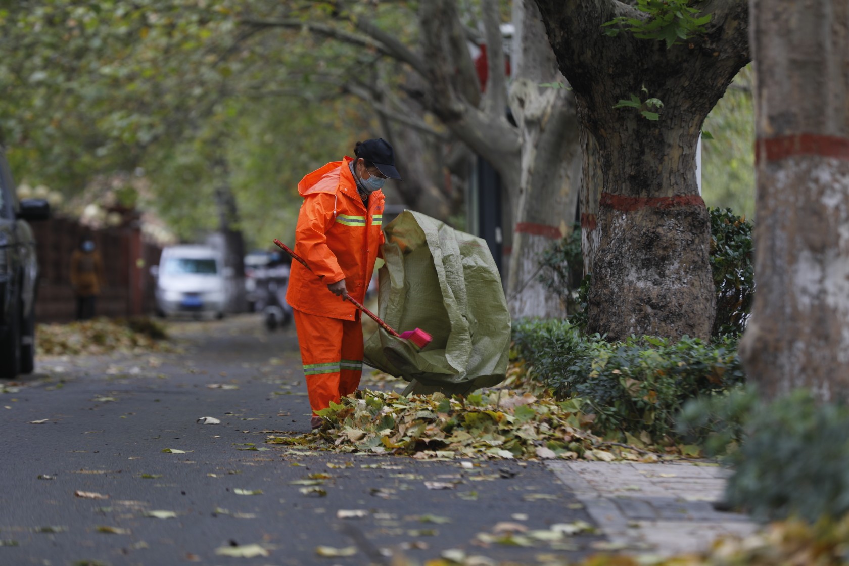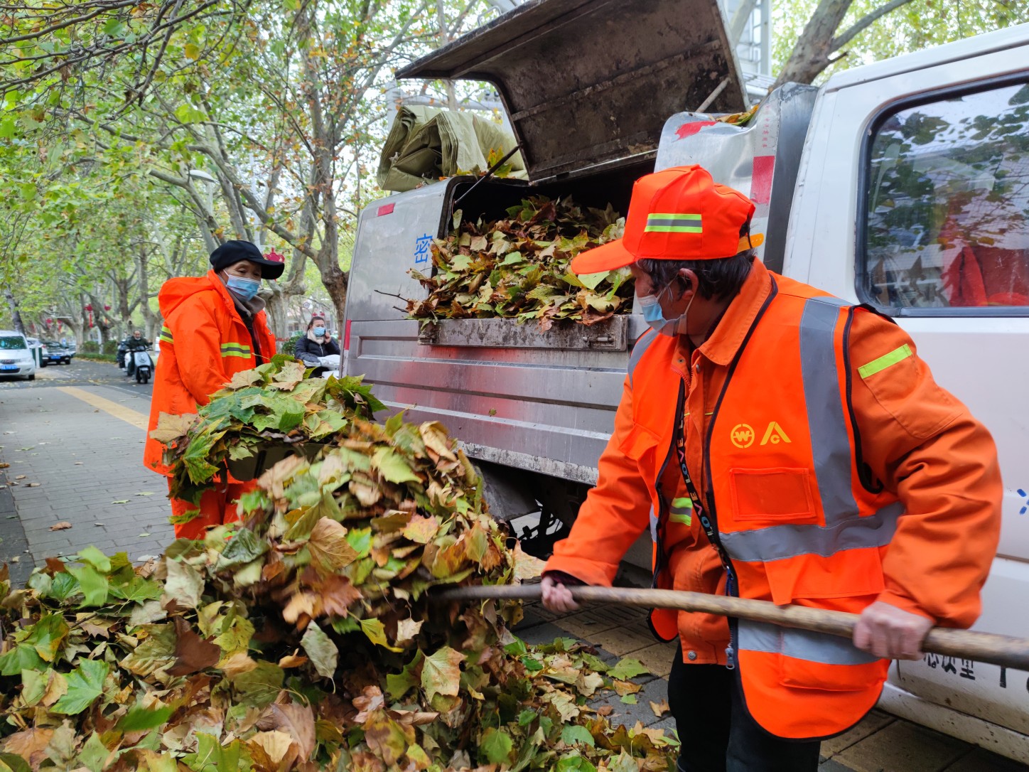 环卫工人正在清扫落叶,主干道上已经清理完毕,等待装车运离