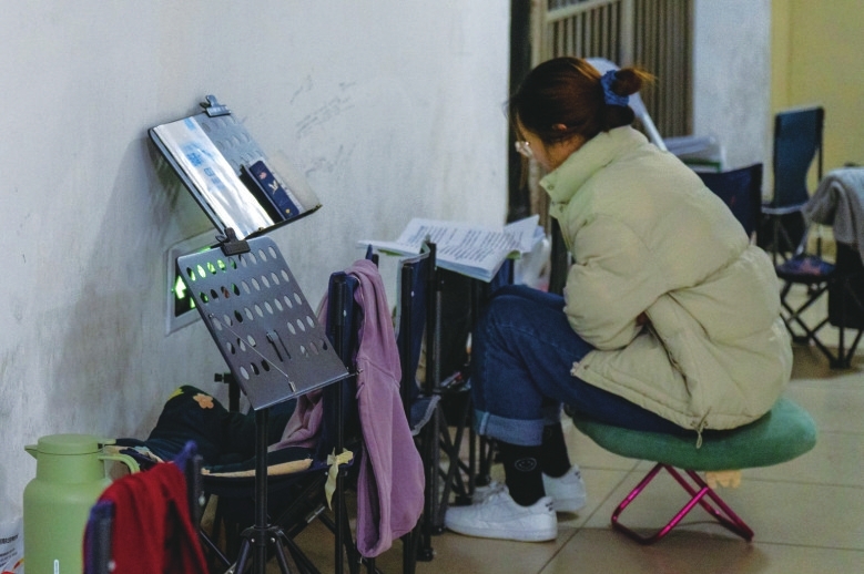 有人自带一个小板凳,备考书籍堆在板凳下,自己面朝墙壁埋头学习;有人选择站着背书,平常放置乐谱的谱架,成了他们的“备考神器”;还有人为了减少他人读书声的干扰,干脆去室外背书。