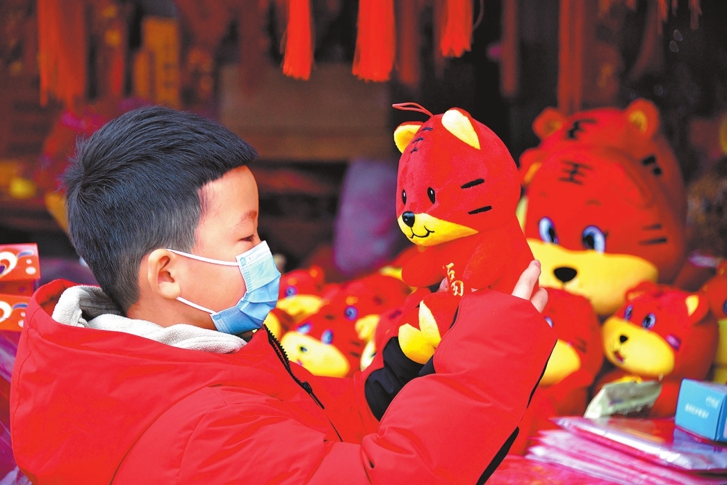 1月12日,小朋友在洛阳市洛龙区关林市场挑选虎年生肖饰品。张光辉 张俊望 摄
