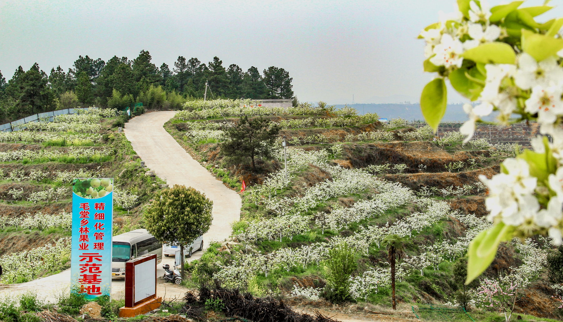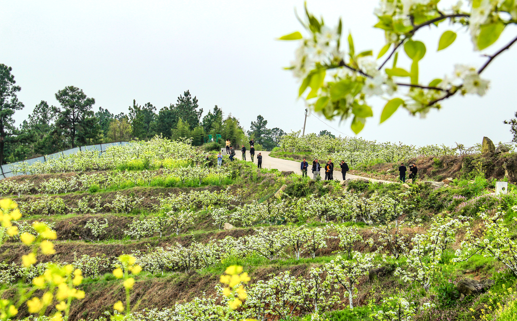 大河网讯 时下,在淅川县毛堂乡黄金梨产业基地内,8000亩有机黄金梨花开争艳,漫山遍野、香气四溢,该基地漫山铺开的梨花与村落的特色民居融汇,勾勒成一幅美丽的山水画。洁白的梨花吸引着游客前来踏青赏花,领略“忽如一夜春风来,千树万树梨花开”的美景。