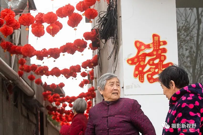 一村民家里办喜事,一条小巷子里挂满红绣球。
