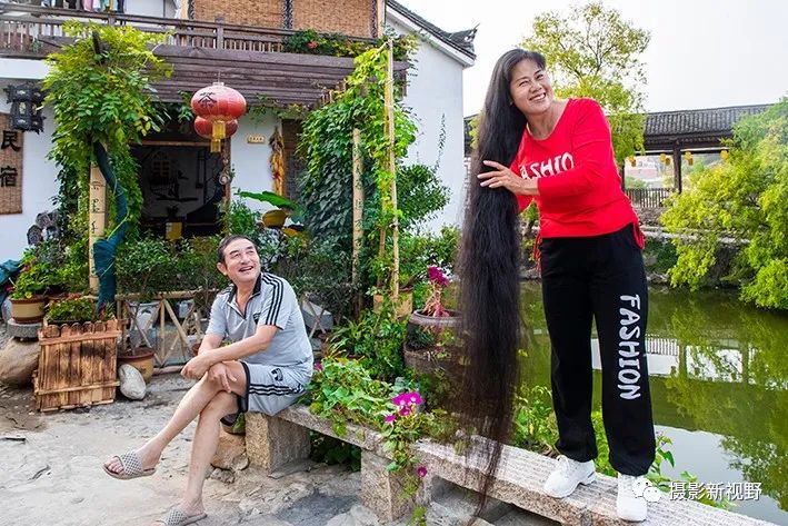 这位站在石条上梳头的是“近水楼台”民宿的经营者。她从广西柳州嫁到该村,头发比身高还长,经常梳个大辫子,人们叫她“大辫子”老板娘。
