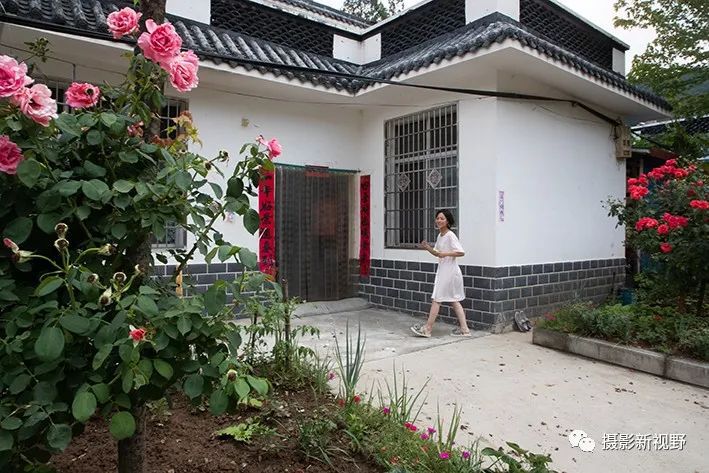 这个易地扶贫搬迁安置点绿化得很好,村民门前盛开月季花。