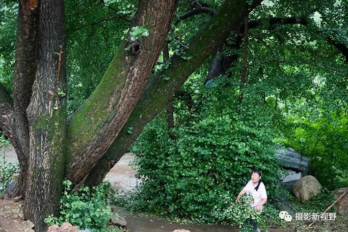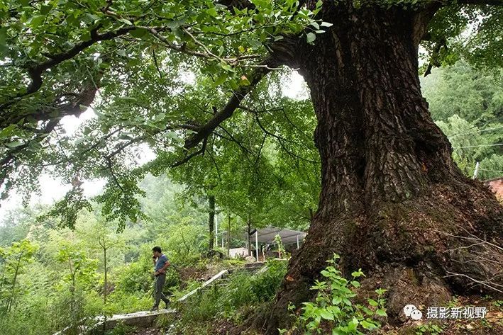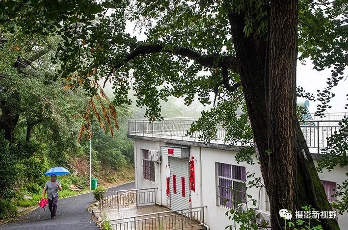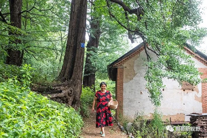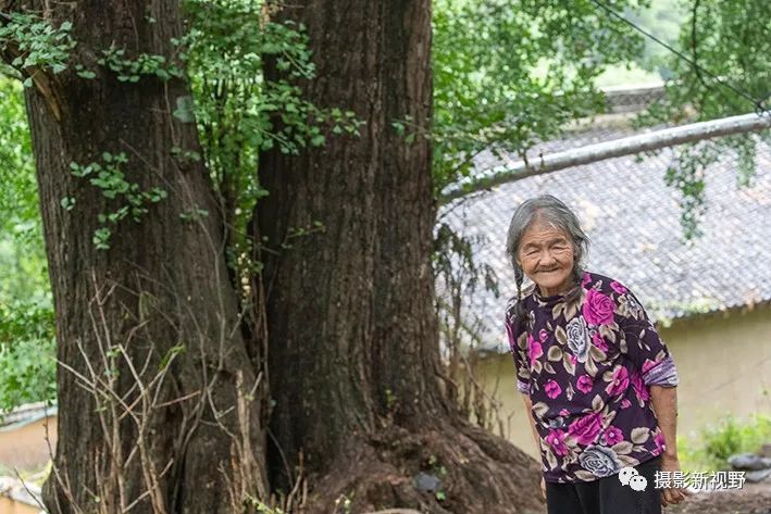 一位老奶奶从古银杏树下走过。古银杏树留住了岁月的沧桑,老奶奶亲身感受到了山村变化。