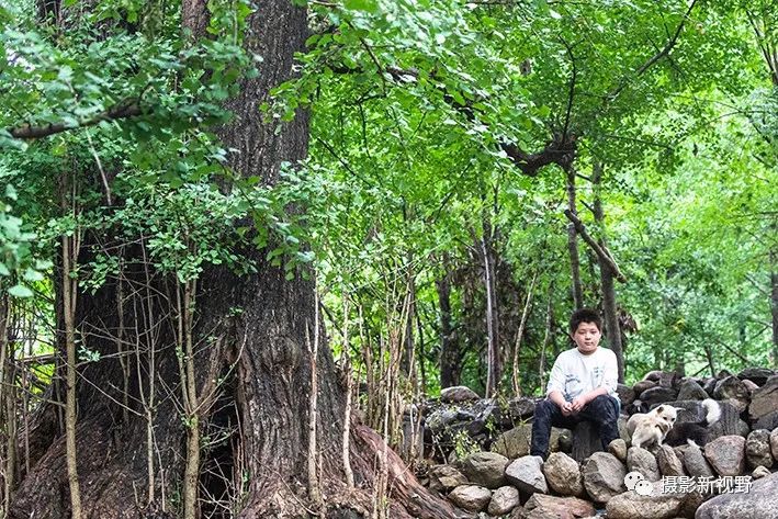 一位小朋友带着小狗在古银杏树下玩耍。这棵千年古银杏树下冒出了一棵棵新苗,使这个古村又焕发出了勃勃生机。