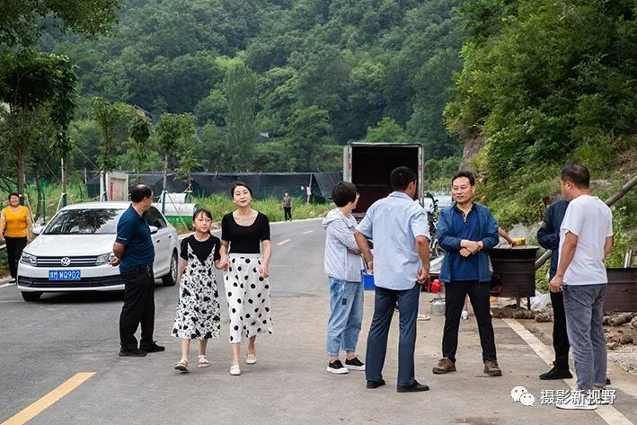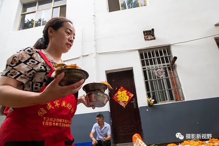 这位大嫂跑前跑后传菜,一直忙个不停。她的围裙上印有“xxx流动餐厅”字号,如今山里人办喜事都由餐饮职业团队操办。