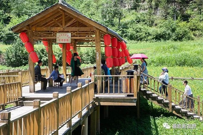 廊桥上的大红灯笼点亮山川,身穿红衣服的城里女人站在花田里竞艳。