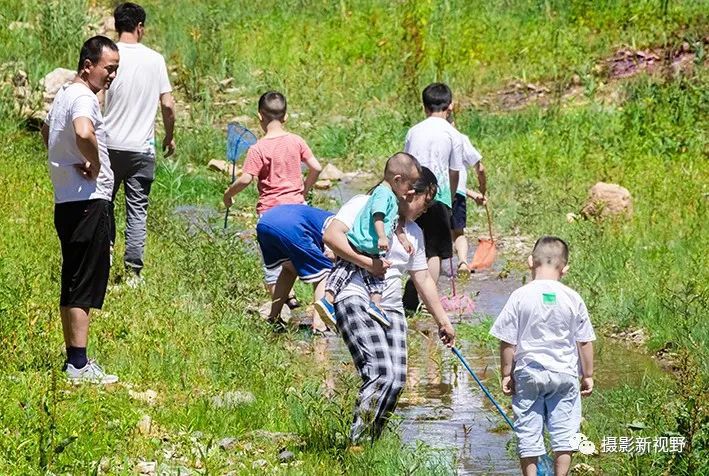 年轻的父母带着孩子来了,他们在花田边的山溪里捉鱼摸虾玩得好开心。