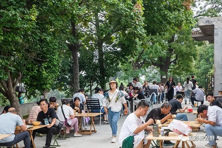山下游客围着小桌吃大锅菜,吃出了山里味道。