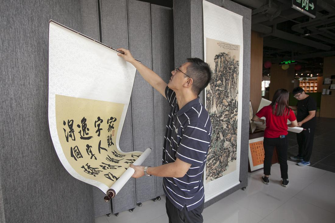 员工在布置书画展览。