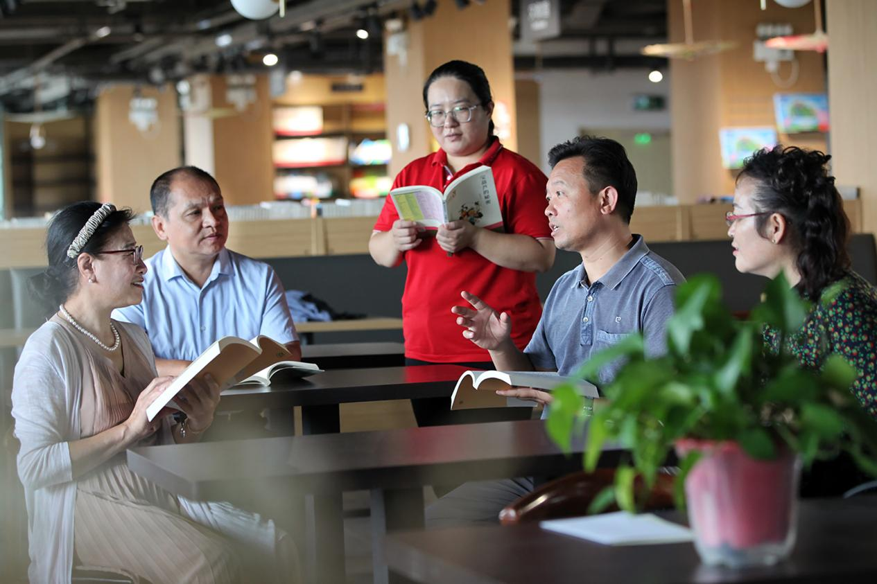 该县朗诵阅读学会的会员们在沙龙角畅谈阅读体会。