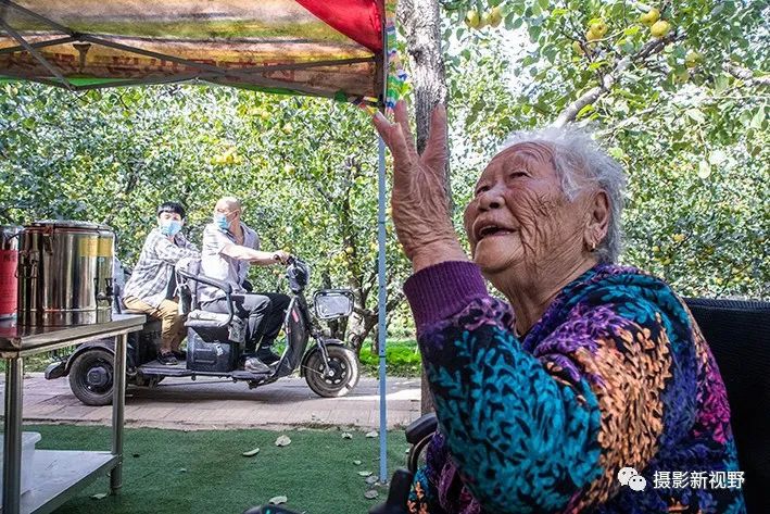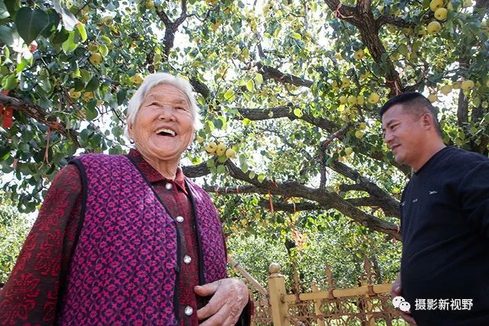 这位老奶奶今年81岁,她天天坐在梨园里与村民一起享受丰收的喜悦。