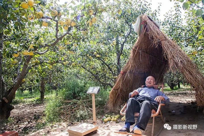 果园里最土的建筑是茅草庵,看梨老汉躺在晃椅上,看着树上结满的金顶谢花酥梨心里乐悠悠。
