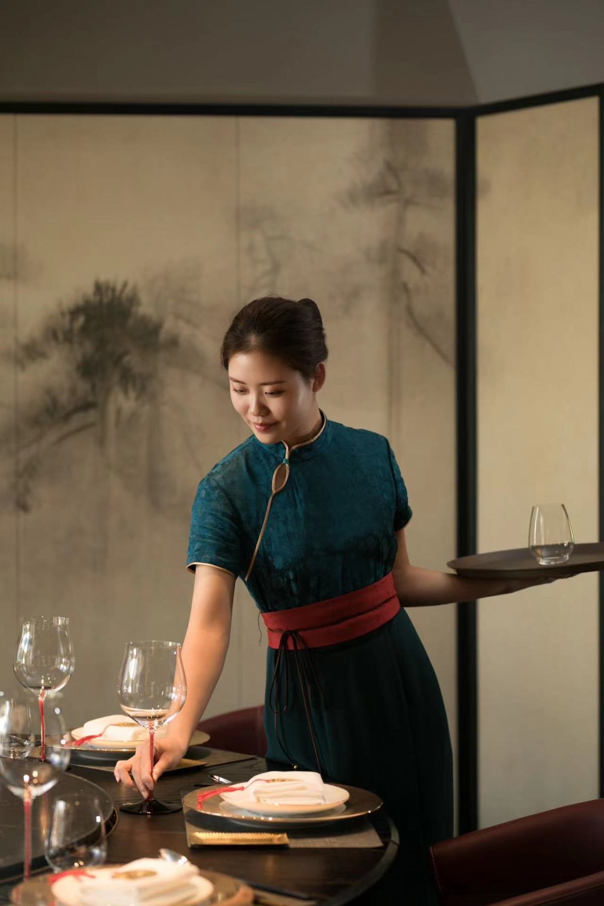 数福的服务标准,对标国内一线城市顶级餐厅。服务员一半以上拥有大学学历,举手投足的仪态、鞠躬的角度甚至微笑的弧度都有一套准则。他们带着温柔亲切的微笑,恰到好处地为客人拉椅子、铺餐巾、分菜,安静而体贴地关注着每位顾客的需求,为客人带来舒适放松的就餐体验。