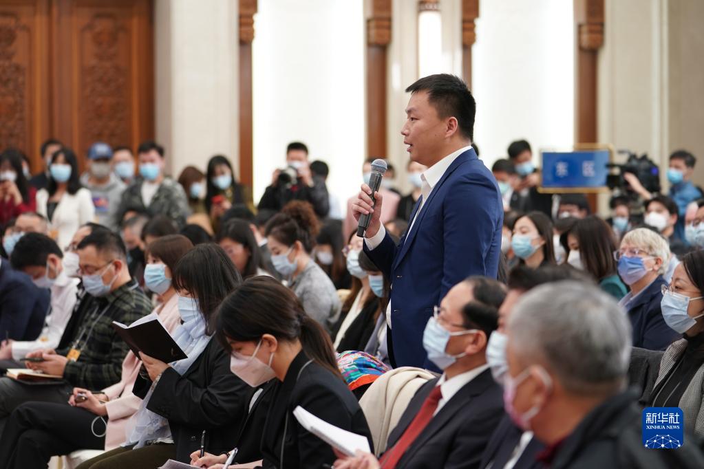 3月4日,十四届全国人大一次会议在北京人民大会堂举行新闻发布会。大会发言人王超就大会议程和人大工作相关问题回答中外记者的提问。这是新华社记者在发布会上提问。