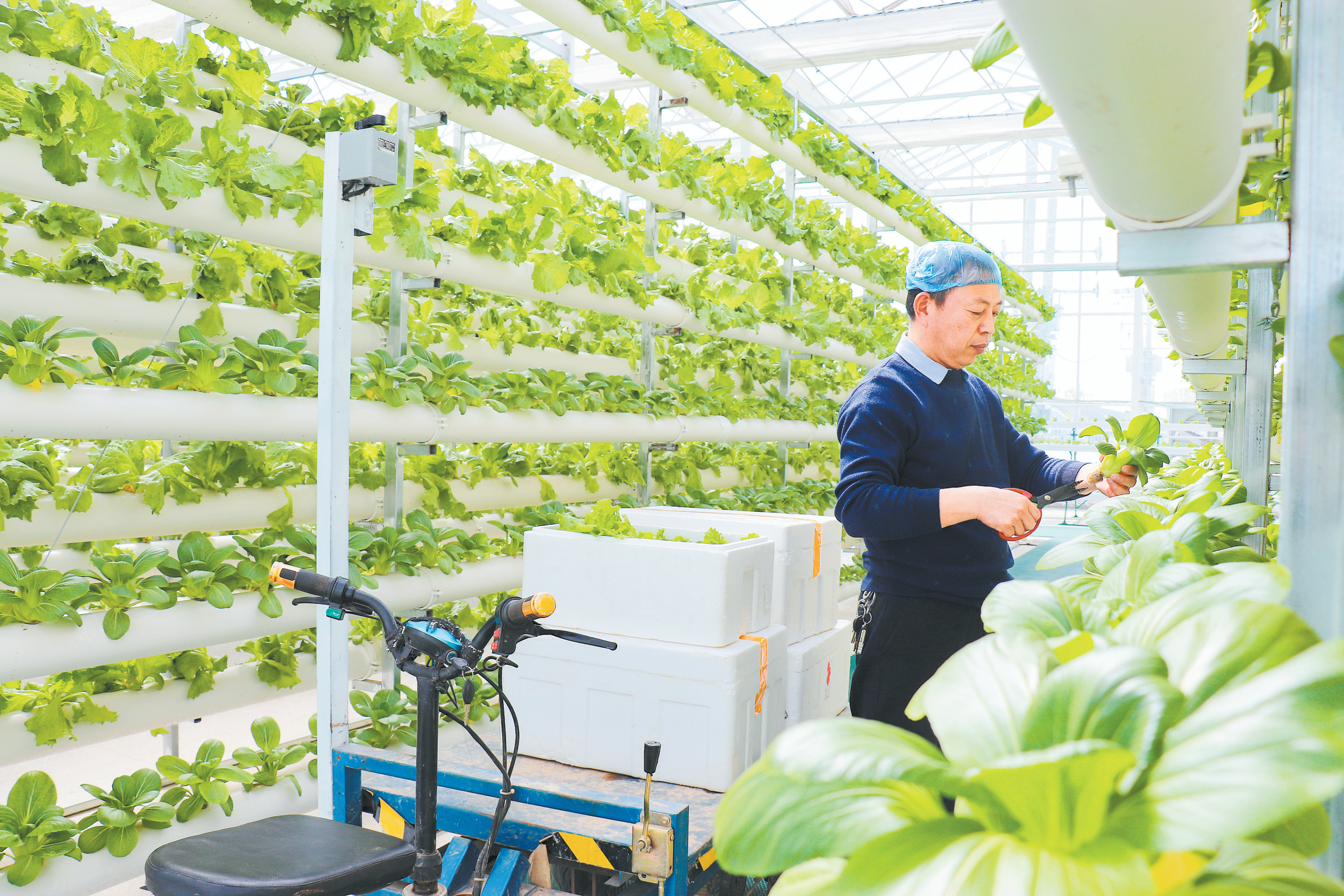 3月28日,扶沟县现代农业产业园的员工在收摘水培叶菜。近年来,扶沟县通过引进立体循环水培和水肥一体化种植技术,产出色泽碧绿、口感鲜脆、营养丰富的有机蔬菜,通过高端直供、订单生产、网络销售、专柜直销等模式,示范引领全省蔬菜现代农业产业园的生产、销售新模式,为省级现代农业产业园创建树立标杆。谷志方 摄