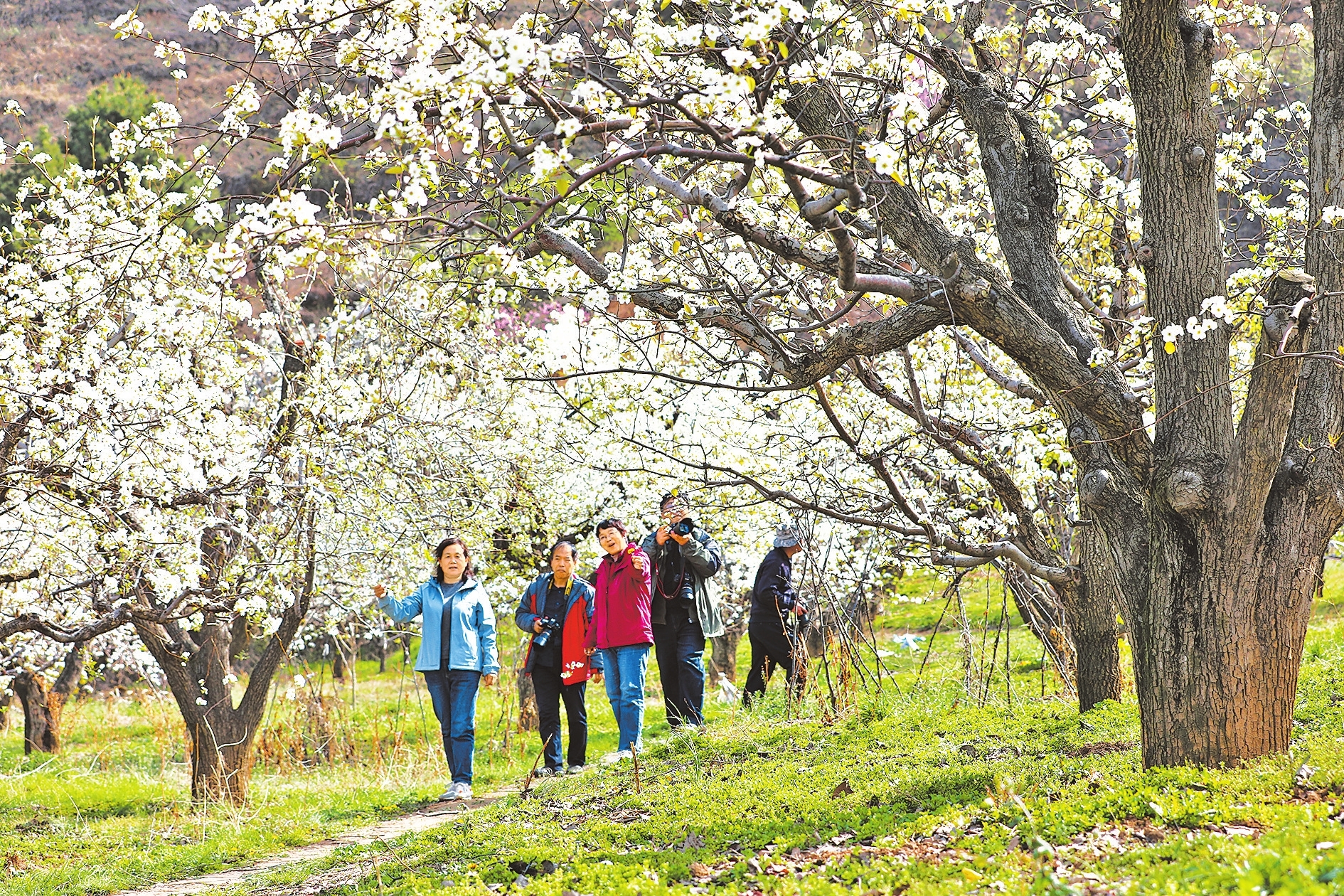 3月30日,灵宝市寺河乡牛心村古梨树花开满枝头,吸引市民前来赏花踏青。当地积极发展旅游农业,带动村民增收,助力乡村振兴。段景波 摄