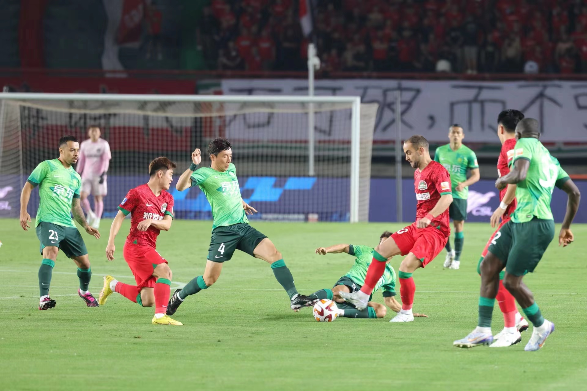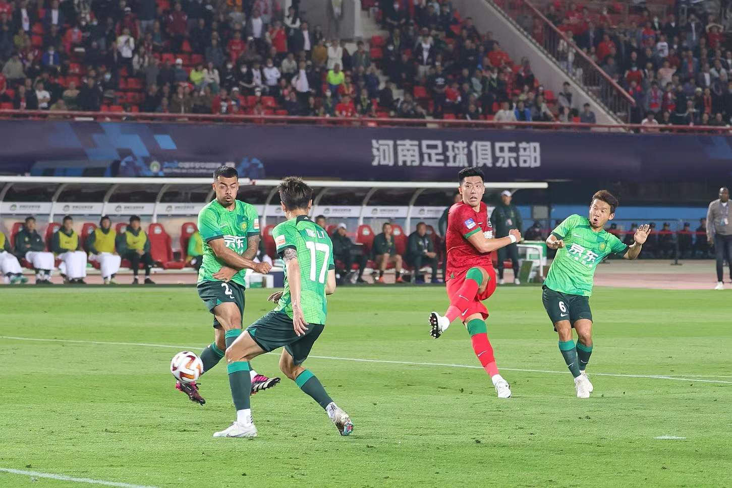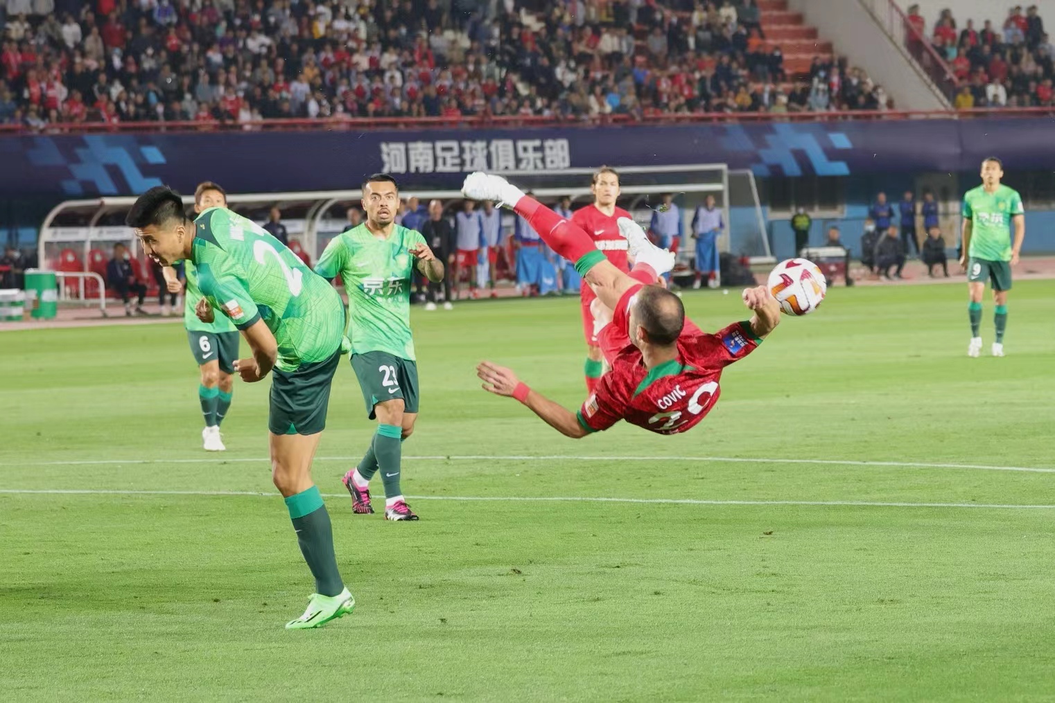 第55分钟,杨立瑜推射得分,北京国安客场1-0领先。第82分钟,河南队科维奇头槌破门。但裁判吹掉了进球,示意压人在先!
