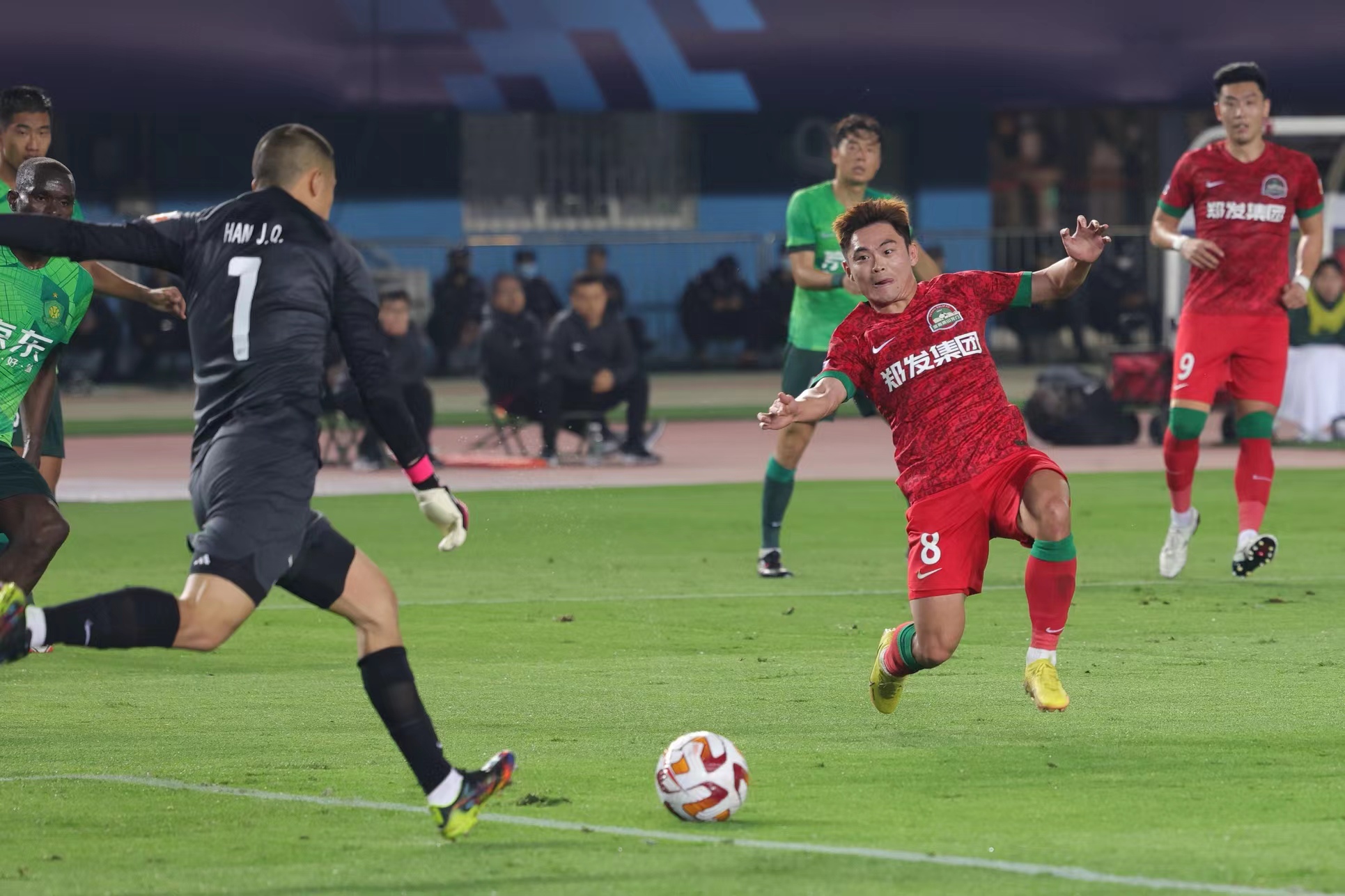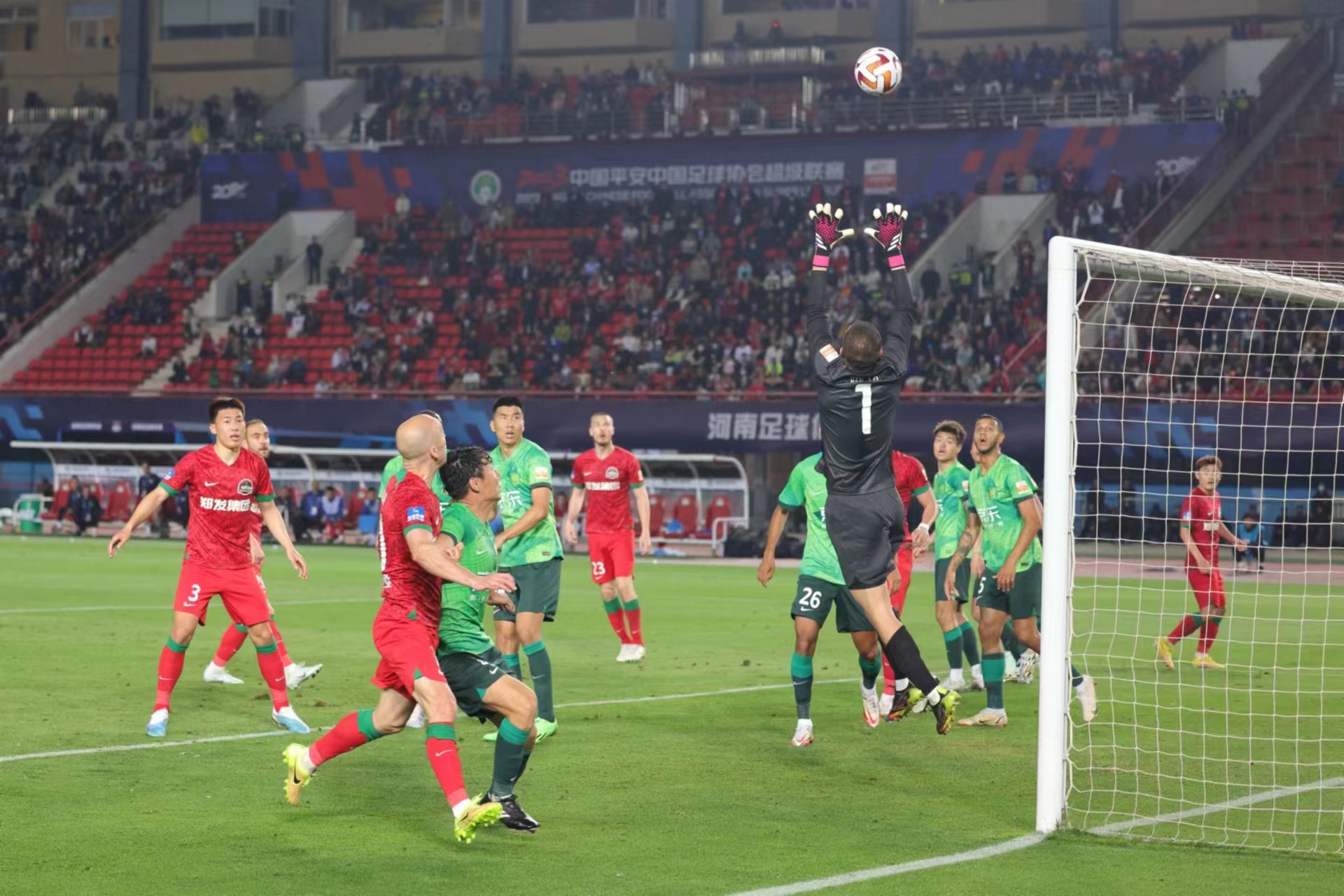 上半场第26分钟,河南队反击,阿德里安分球,冯伯元和黄紫昌的两连击都被国安门将韩佳奇两连扑化解!