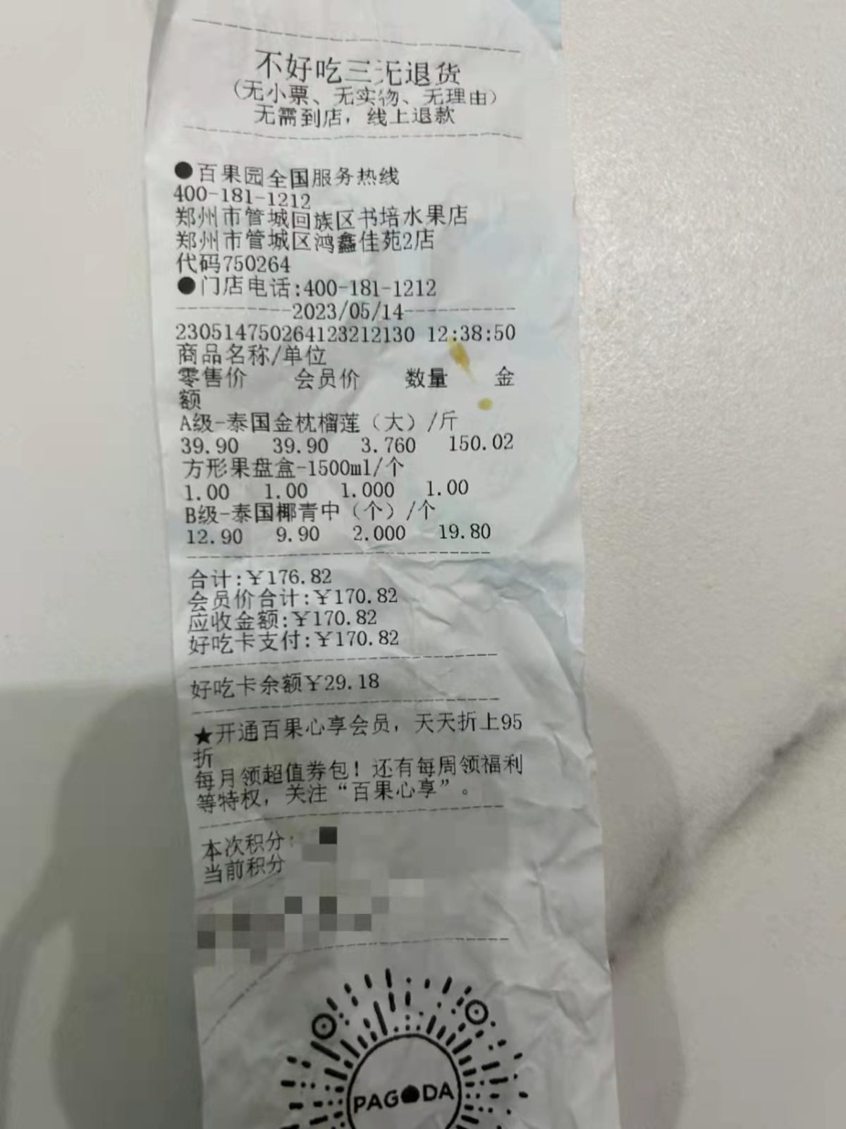 求助市民李女士说,她和朋友是5月14中午,到郑州市西大街上的百果园水果店买水果。因前几天答应给孩子买个榴莲吃,她就和朋友买了一个3斤多150多元的泰国金枕榴莲,以及其他水果。
