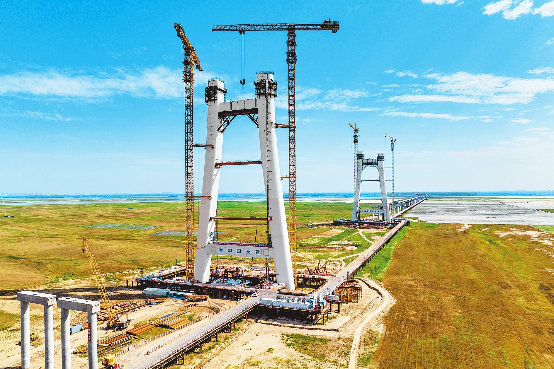6月2日,由中交二航局承建的安罗高速黄河特大桥北主塔中横梁最后一节重达27.3吨的钢箱梁顺利吊装,大桥主塔中横梁完成合龙。该大桥主塔预计今年8月封顶,主塔左右幅各由36个节段钢壳塔组成,总高182米。聂冬晗 靳晰 摄