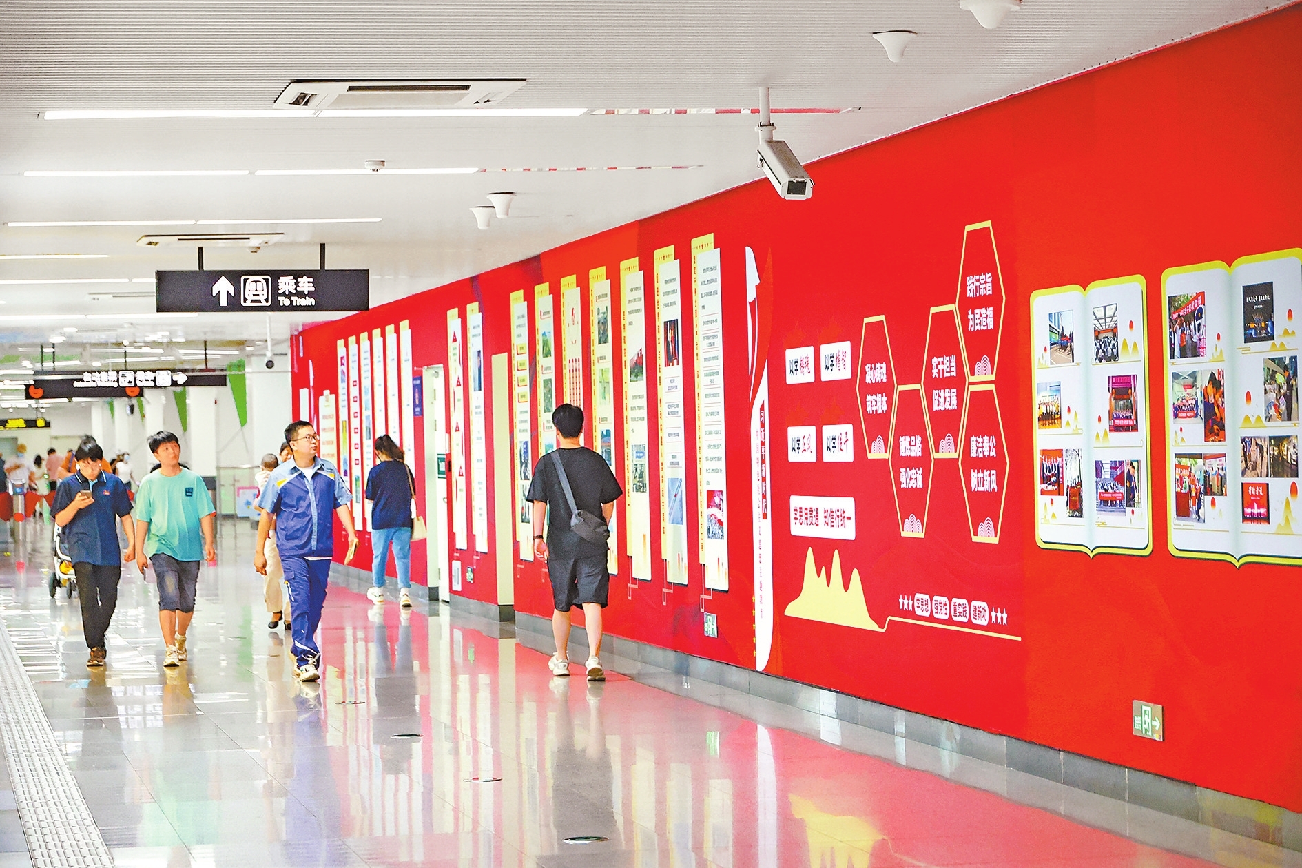 6月28日,乘客经过郑州地铁5号线齐礼阎站的党建主题长廊。为充分发挥地铁宣传载体作用,郑州地铁打造党建主题车站,让市民更好地追寻红色记忆,不断扩大红色文化的时代价值和引领效应。本报记者 聂冬晗 摄