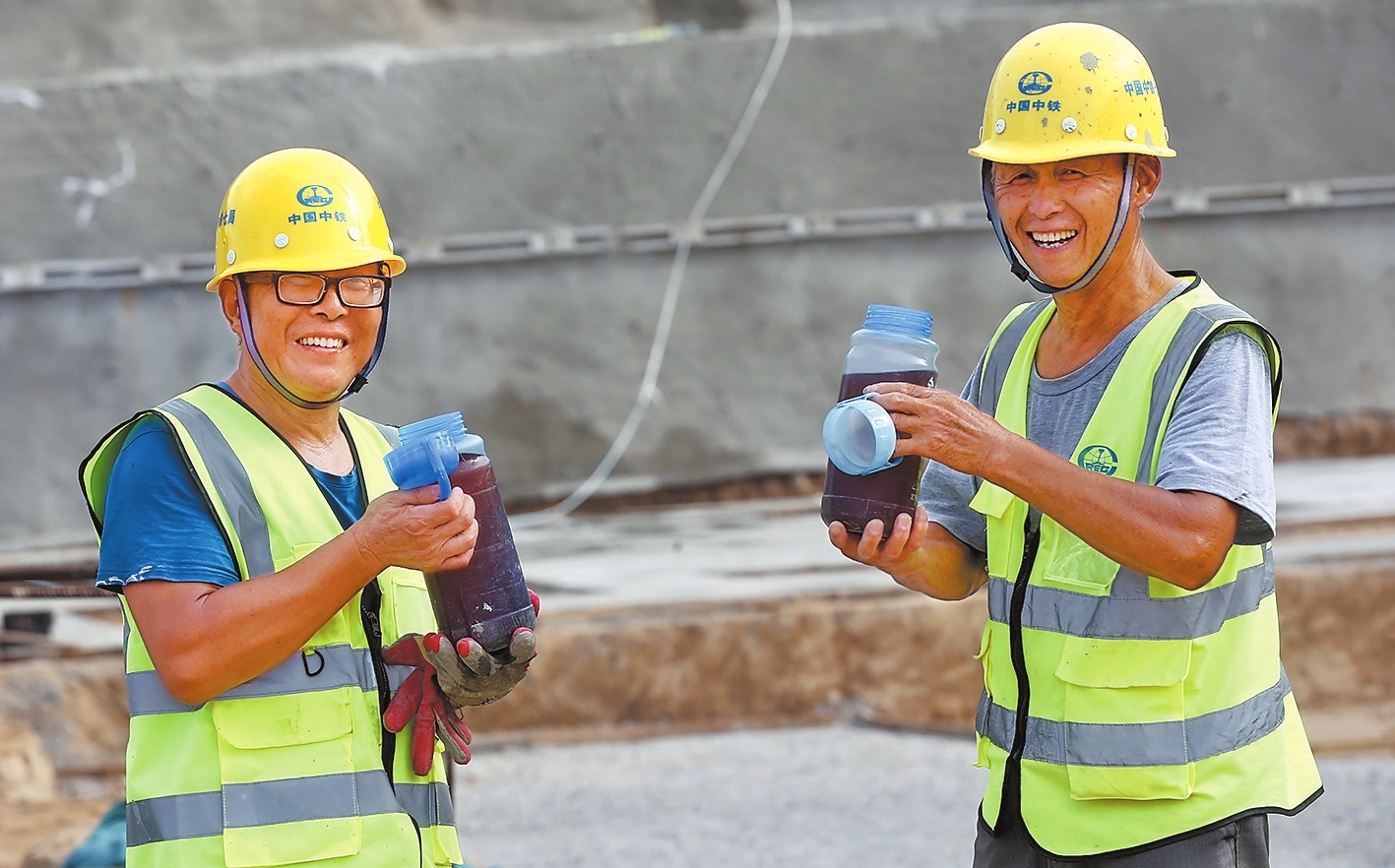图① 郑州市中原区旮旯王村棚户区改造项目工地上,施工人员正在喝绿豆水降温。本报记者 王铮 摄