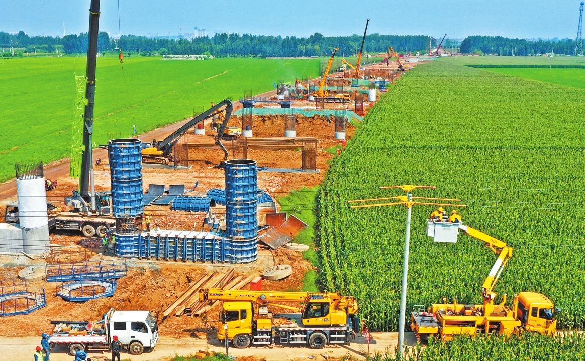 8月30日,河南省交通重点工程沁伊高速孟州市化工镇新北村片区施工现场,国网孟州市供电公司工作人员正在进行电杆敷设和电缆入地施工。白水平 陈欢欢 摄