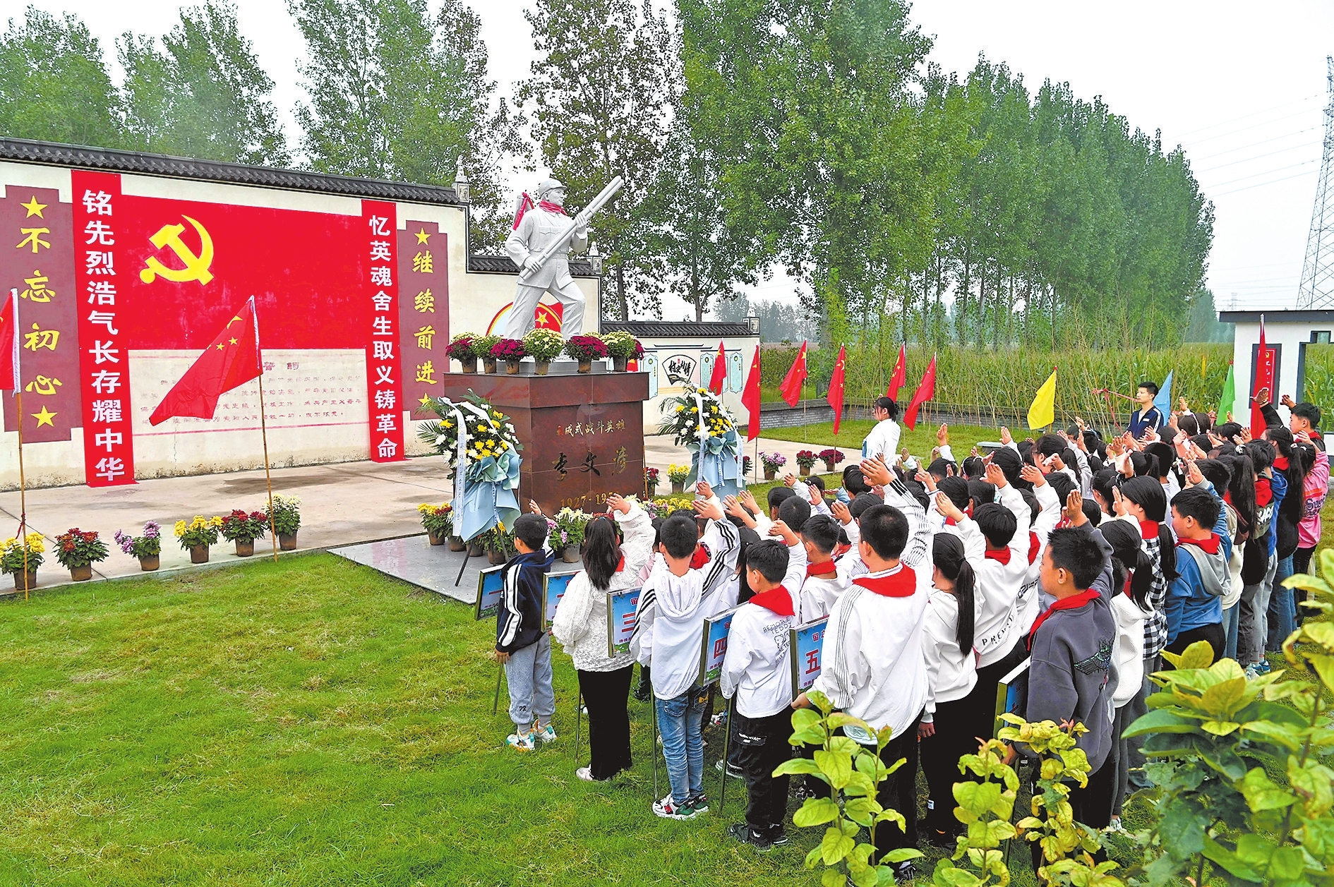 9月28日,沁阳市西万镇留庄村学生在该村抗美援朝志愿军英雄、特等功臣李文彦烈士纪念园,缅怀革命先烈。杨帆 吕炜 摄