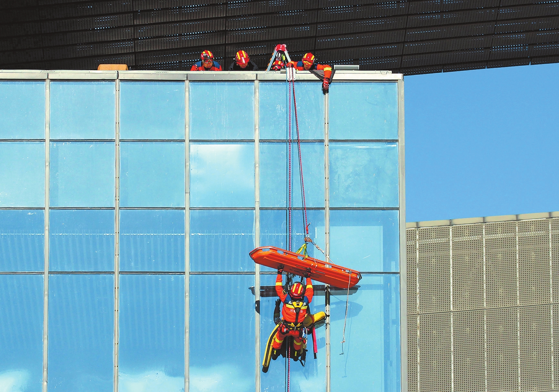 11月6日,南阳大剧院广场,消防员进行高空喷水施救综合演练。当日,南阳市举行“119”消防宣传月启动仪式暨灭火救援综合演练,提升全民消防安全意识。高嵩 摄