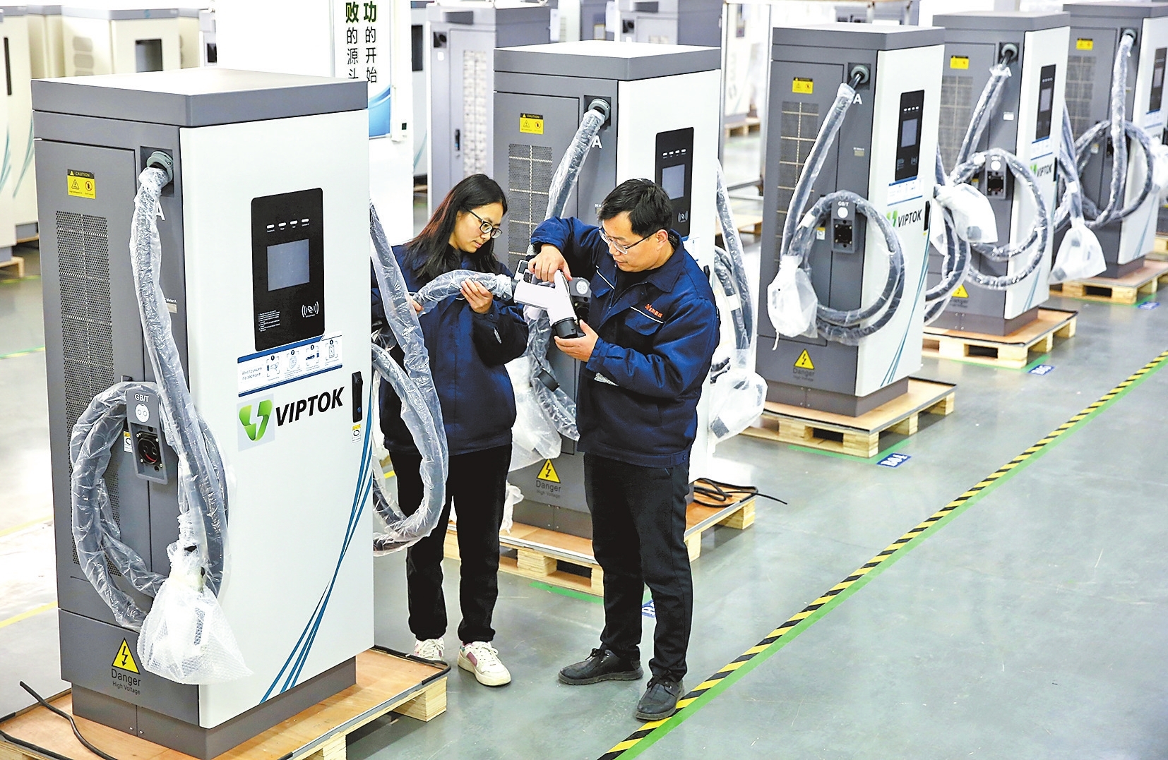 11月29日,洛宁县洛阳嘉盛电源科技有限公司生产车间,工人正在组装汽车充电桩设备。该企业从事新能源电动汽车充电设备产品研发、制造和销售,目前正奋力冲刺,确保完成年度任务。本报记者 王铮 摄