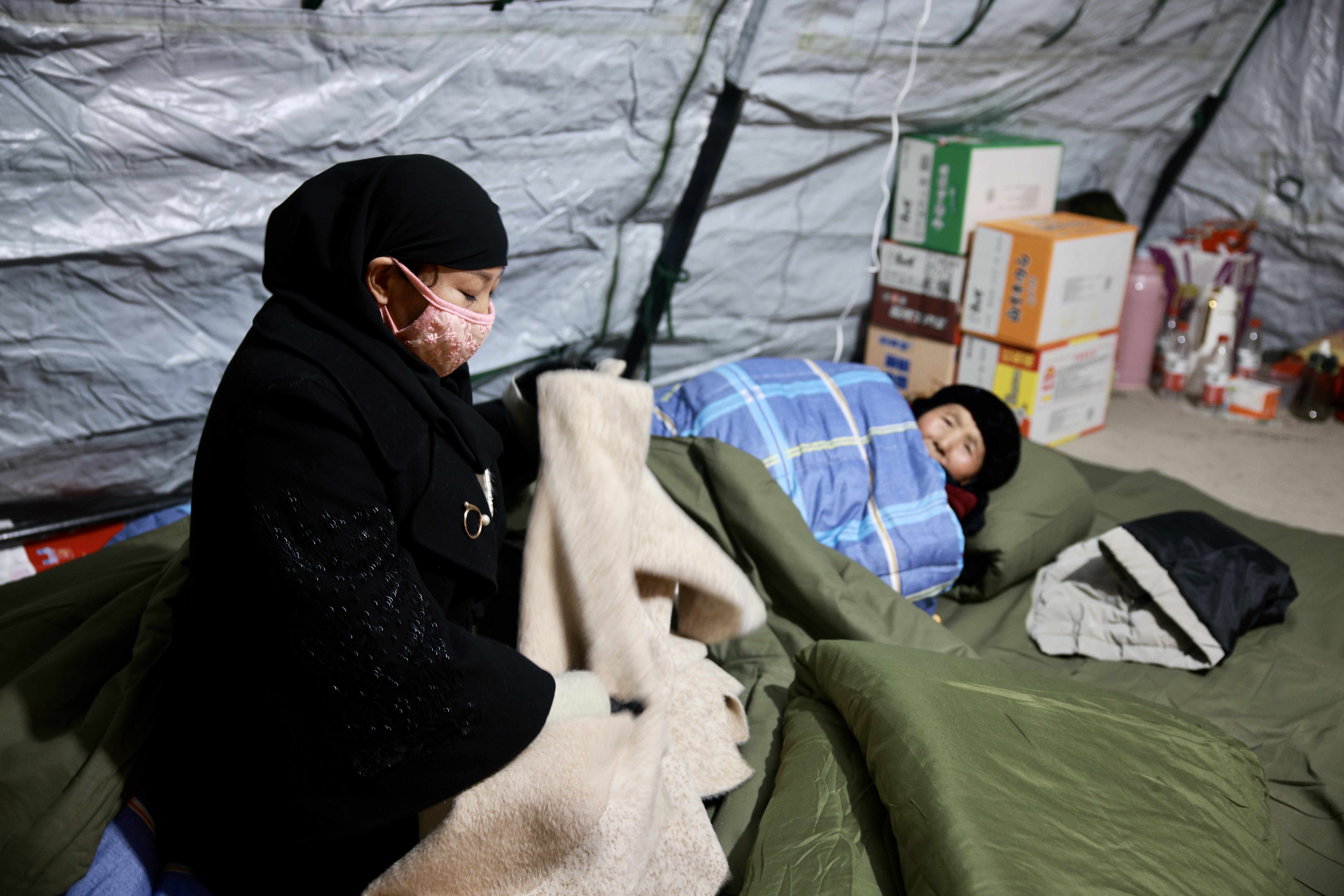 由于帐篷内是用煤炉取暖,夜间值班的救援队员不时地检查每个帐篷内的情况,防止村民煤气中毒。