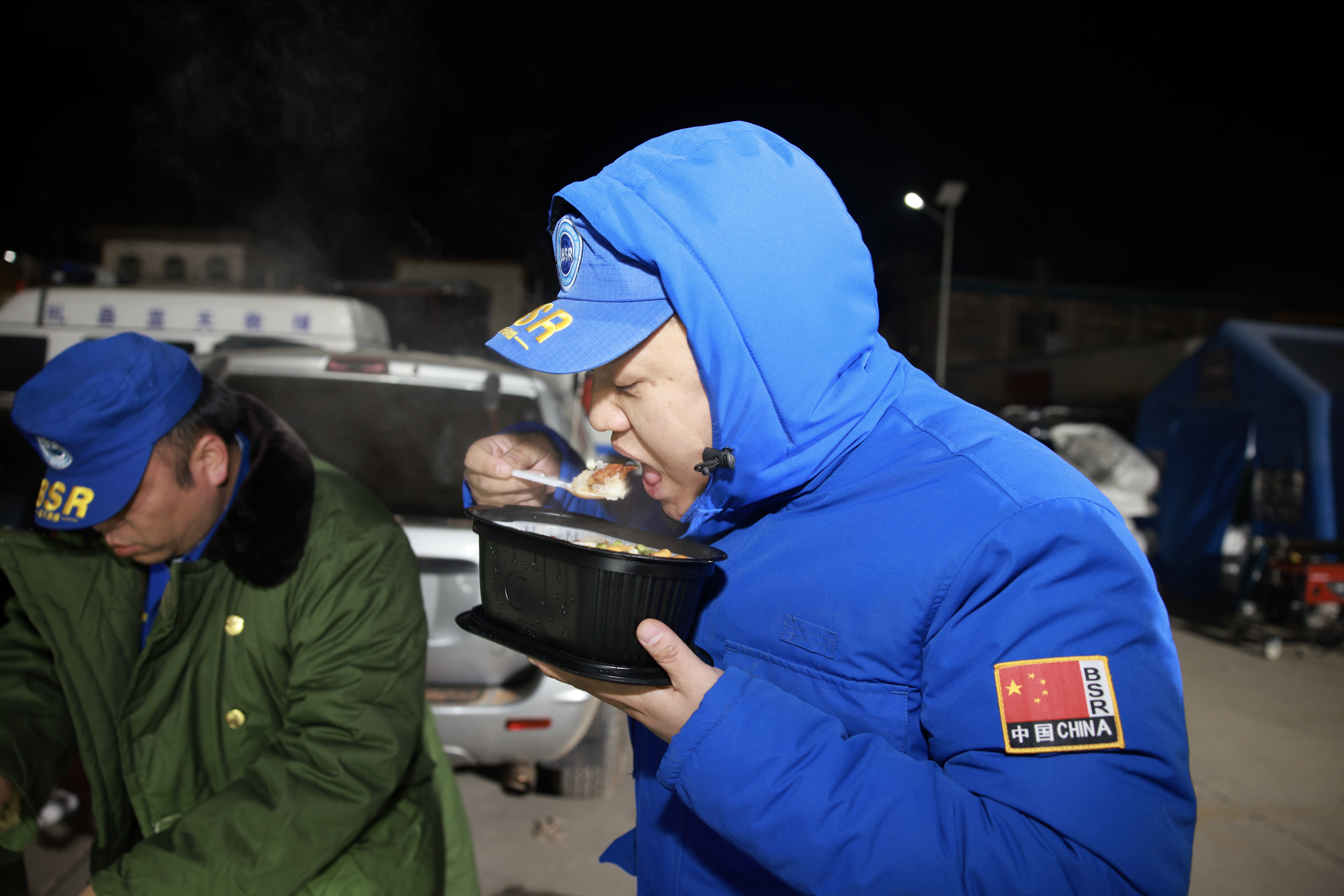 此时安置点内大部分的村民已进入梦乡,但救援队在忙碌了一整天后,才刚刚吃上第一顿热饭。