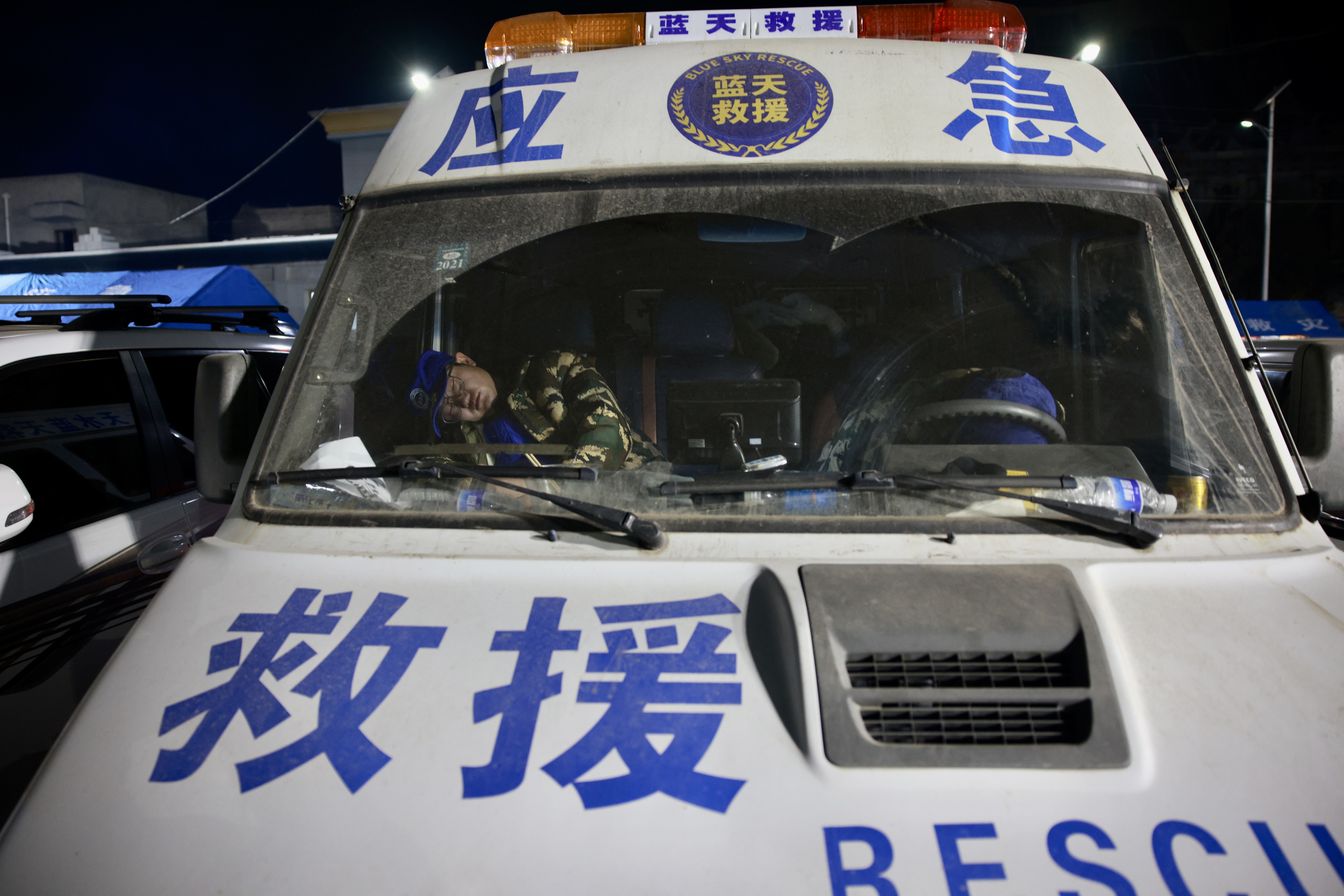 由于救灾物资匮乏,救援队把帐篷和板床都送给了村民,队员们睡在了车里。