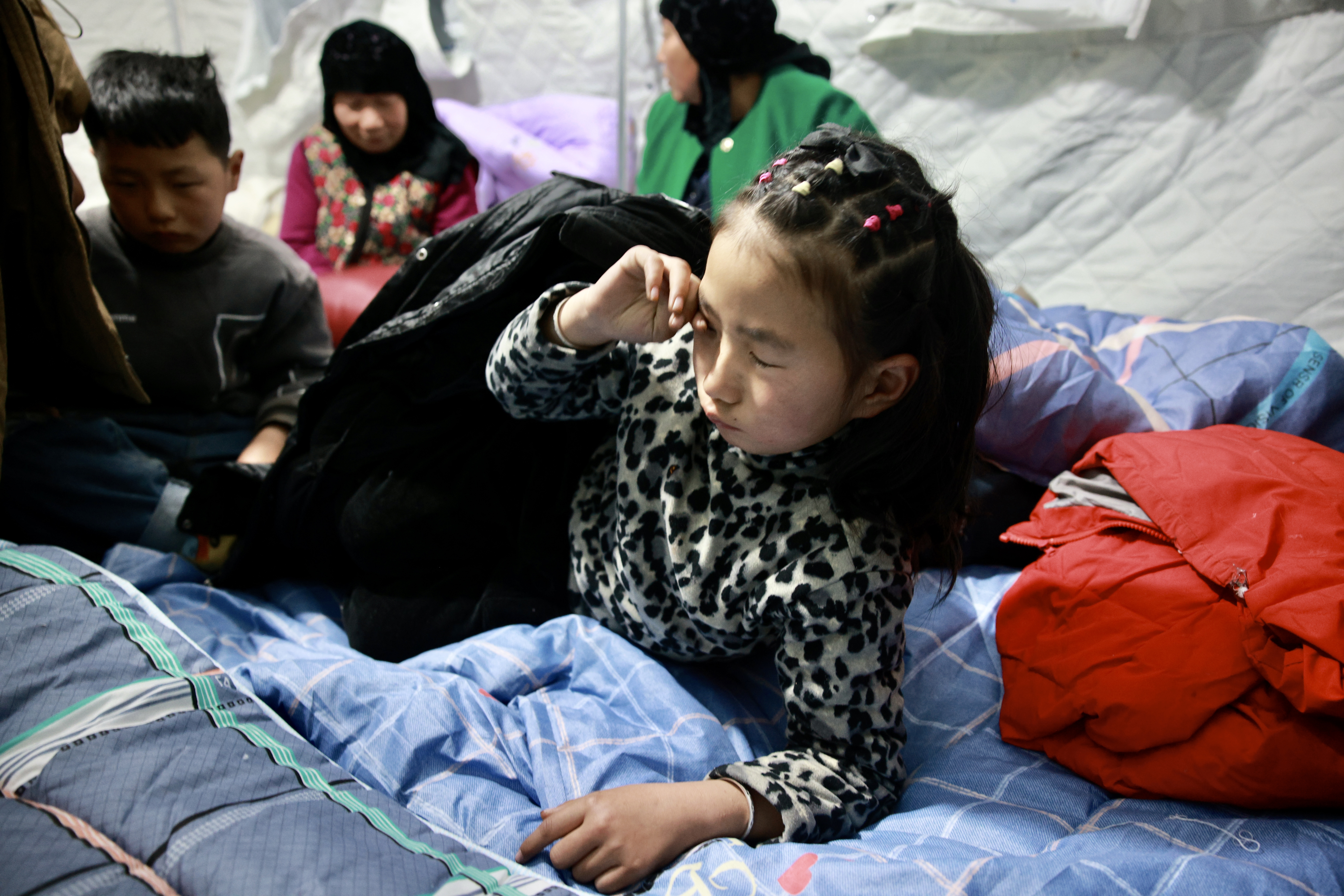温暖的帐篷内,小女孩揉着惺忪睡眼。