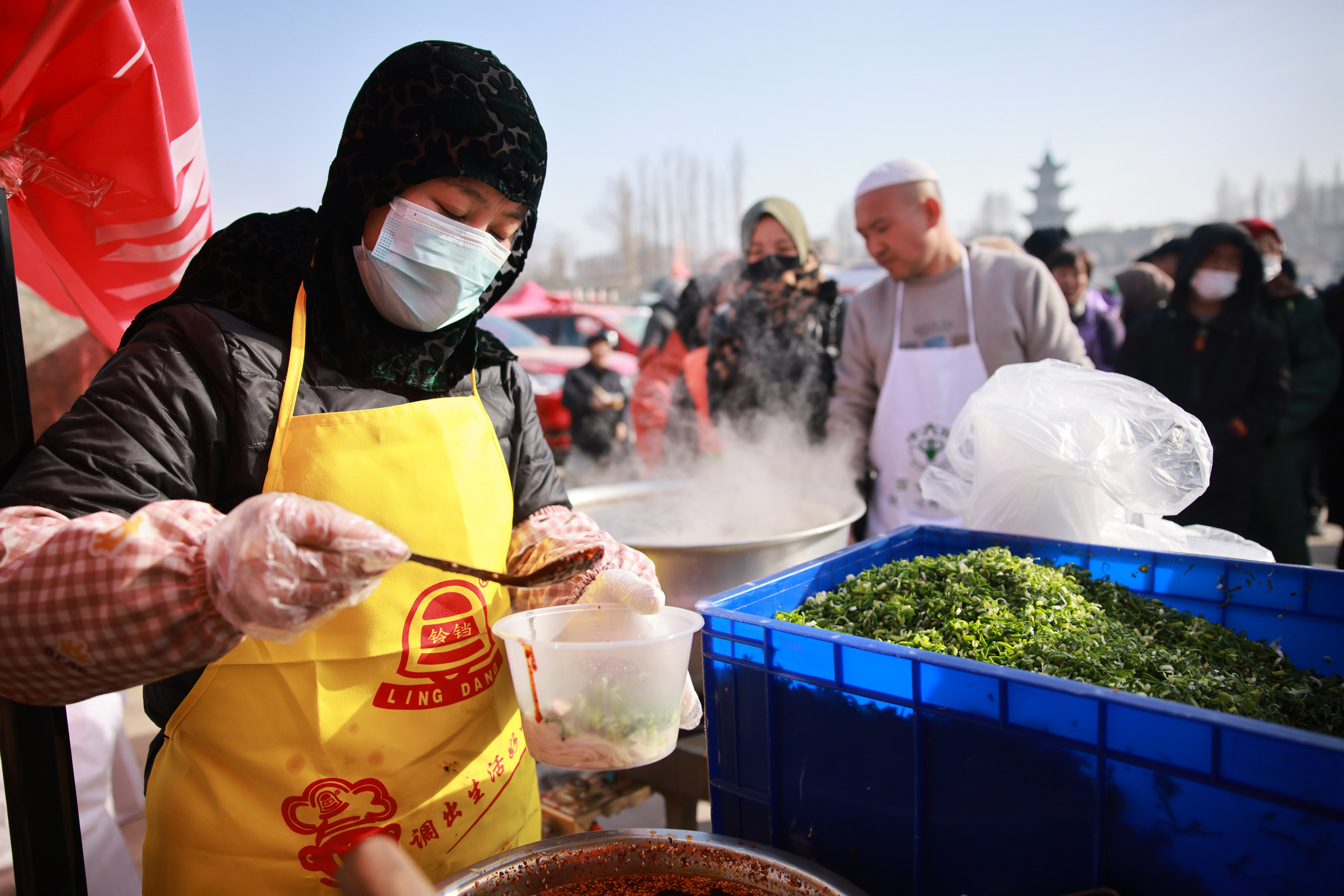 午餐时间,许多连夜从外地赶来的厨师们支起了爱心面摊,做得是正宗兰州牛肉面,整个安置点内面香四溢。