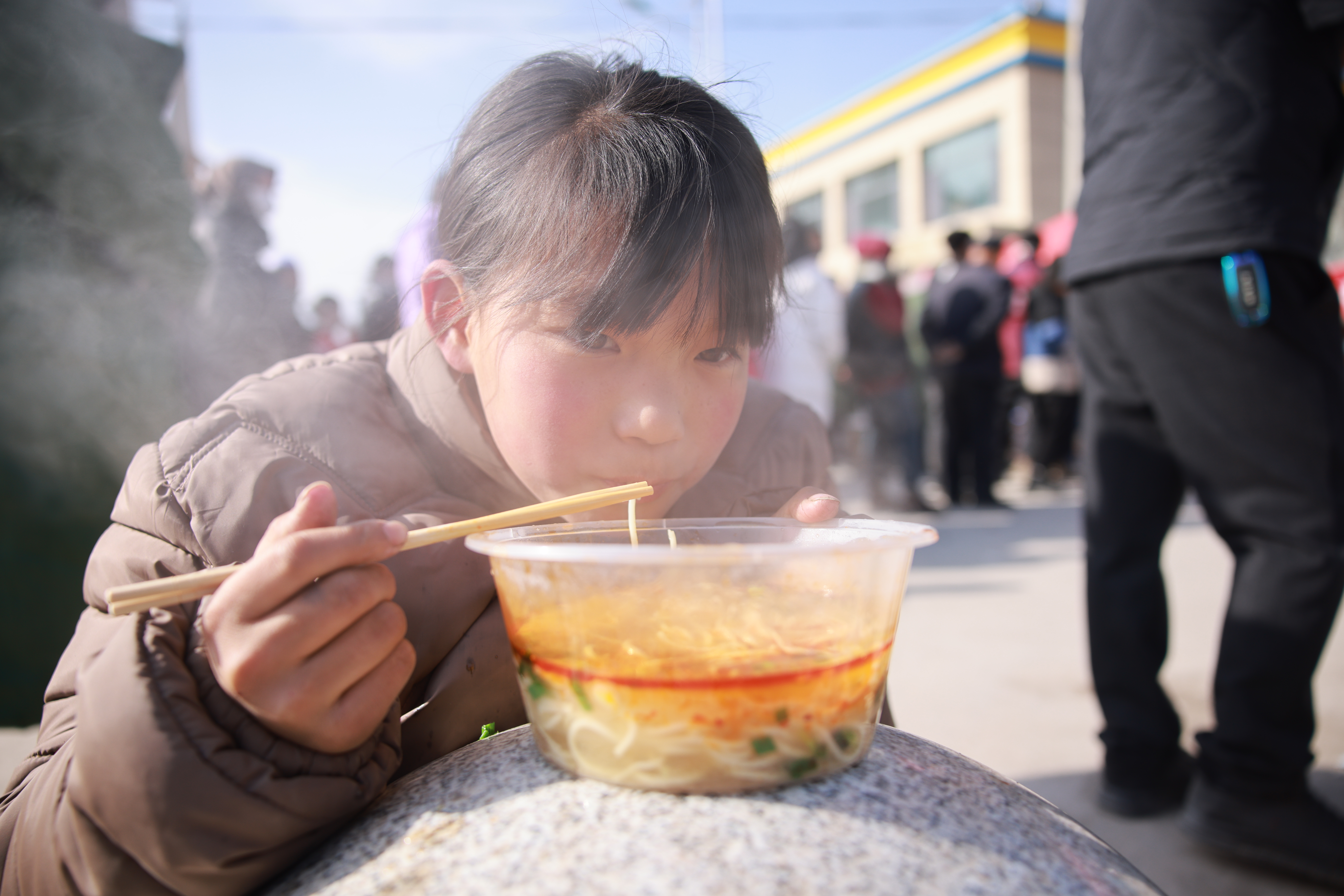 “好吃!好吃!真好吃!”一个小女孩趴在石墩上吃着香喷喷的牛肉面。