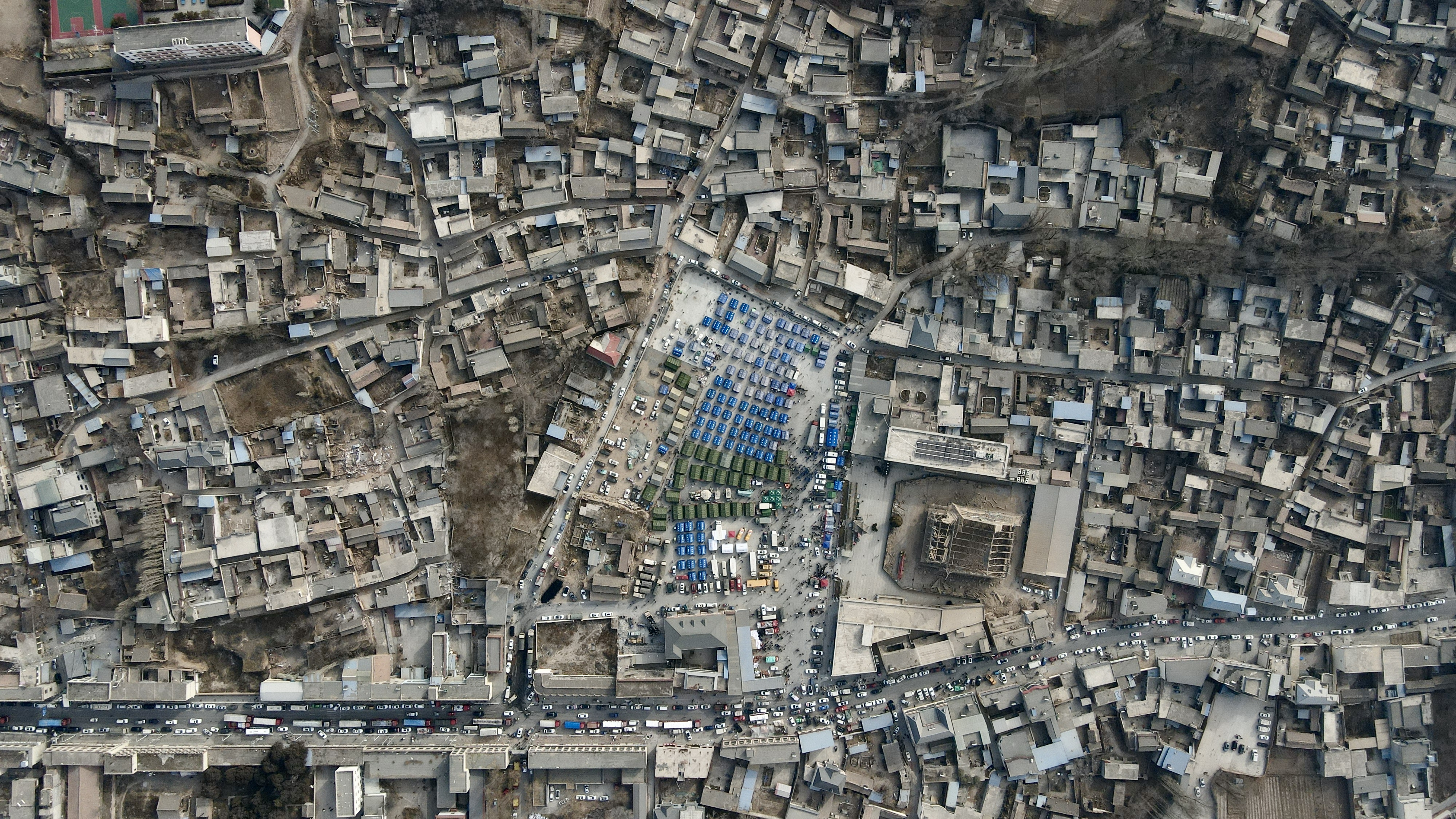 从空中俯瞰,大河家镇安置点内的帐篷整齐排列,门口的雄关路上,从全国各地赶来的救灾物资货车排起长队。
