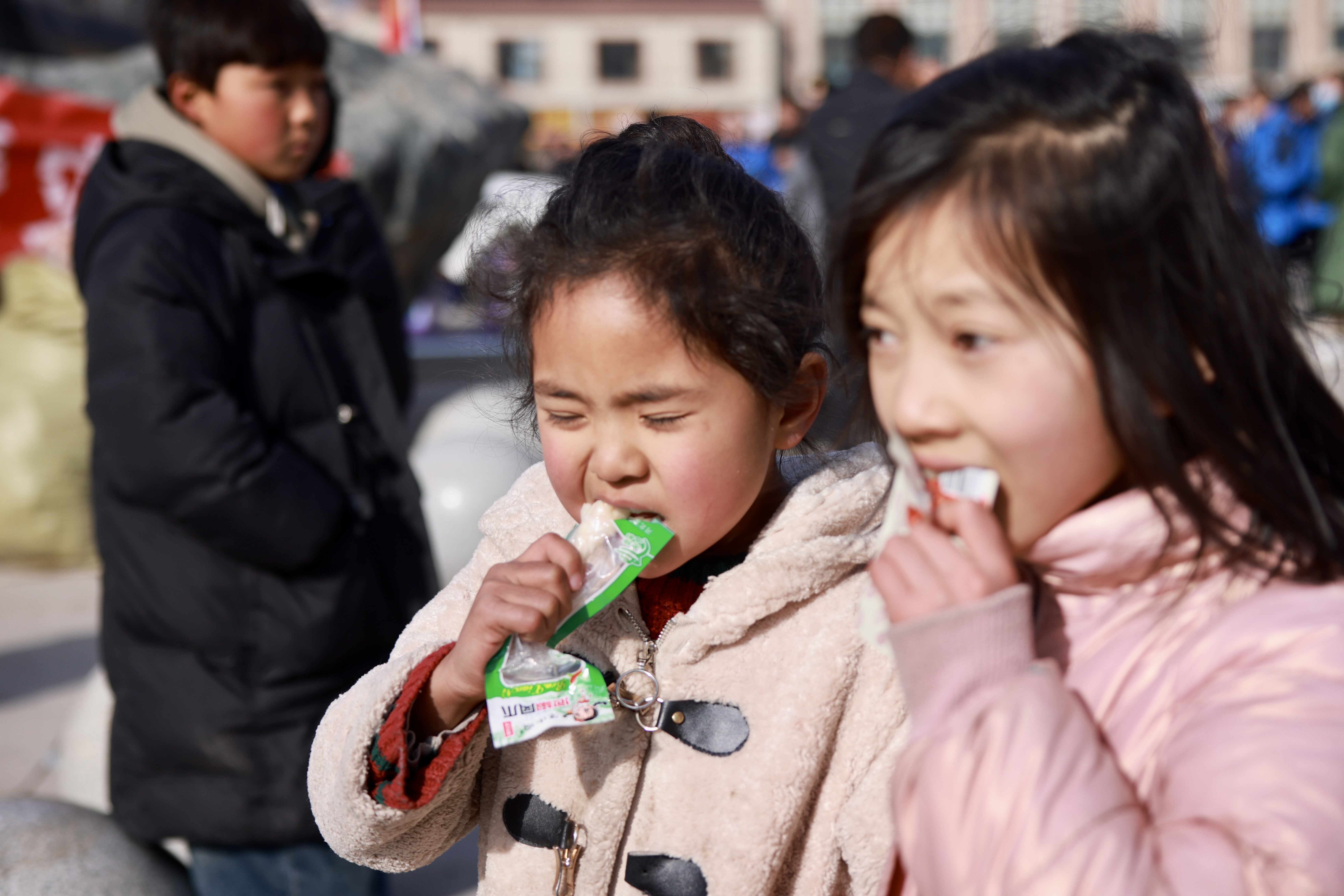 陆续抵达的救援车队带来了更加丰富的物资,小女孩们边走边吃着零食。