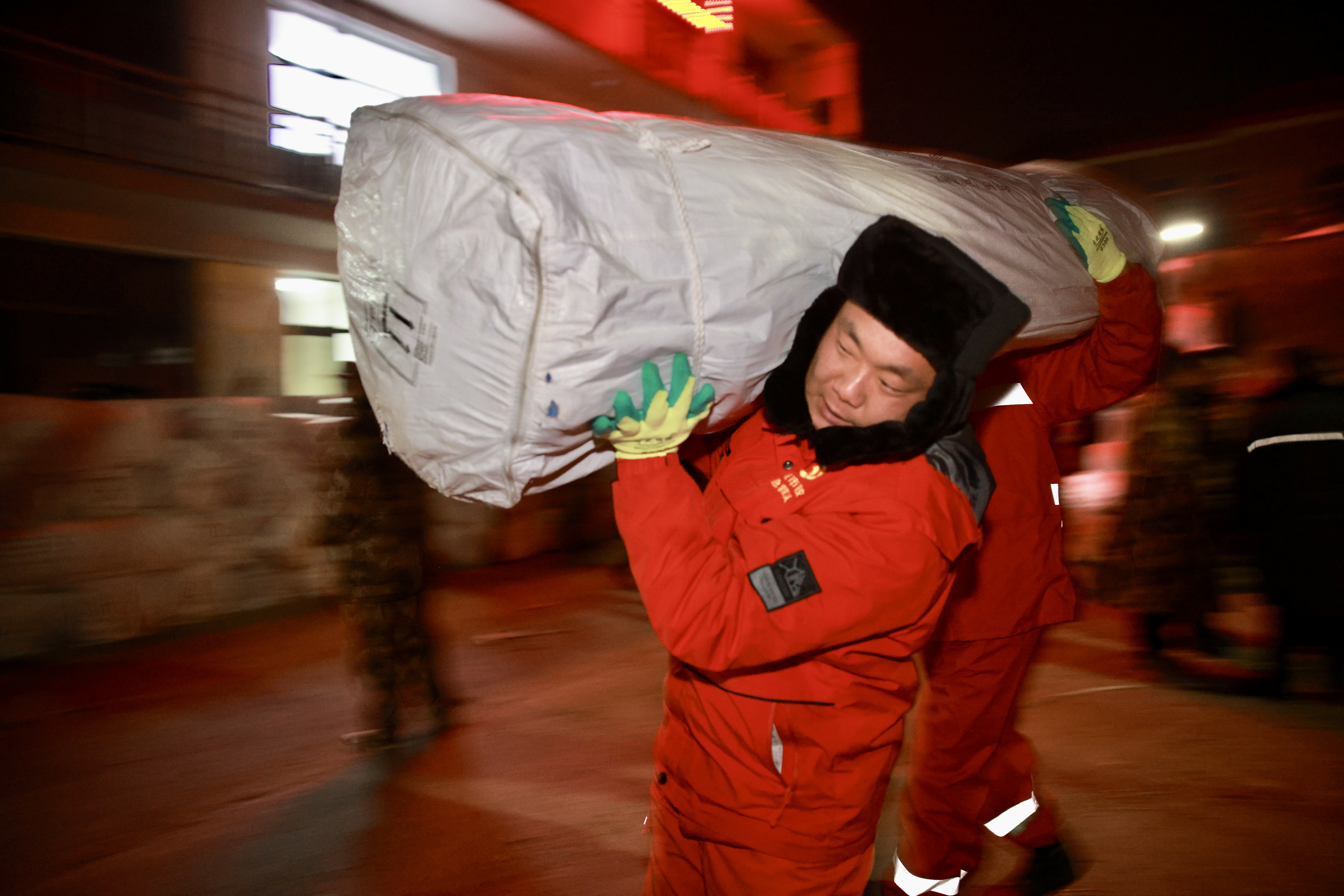 傍晚,又一批河南的救援队赶到,为了尽快疏通物资车辆运输道路,队员们戴上手套便开始帮助前方车队搬运物资。