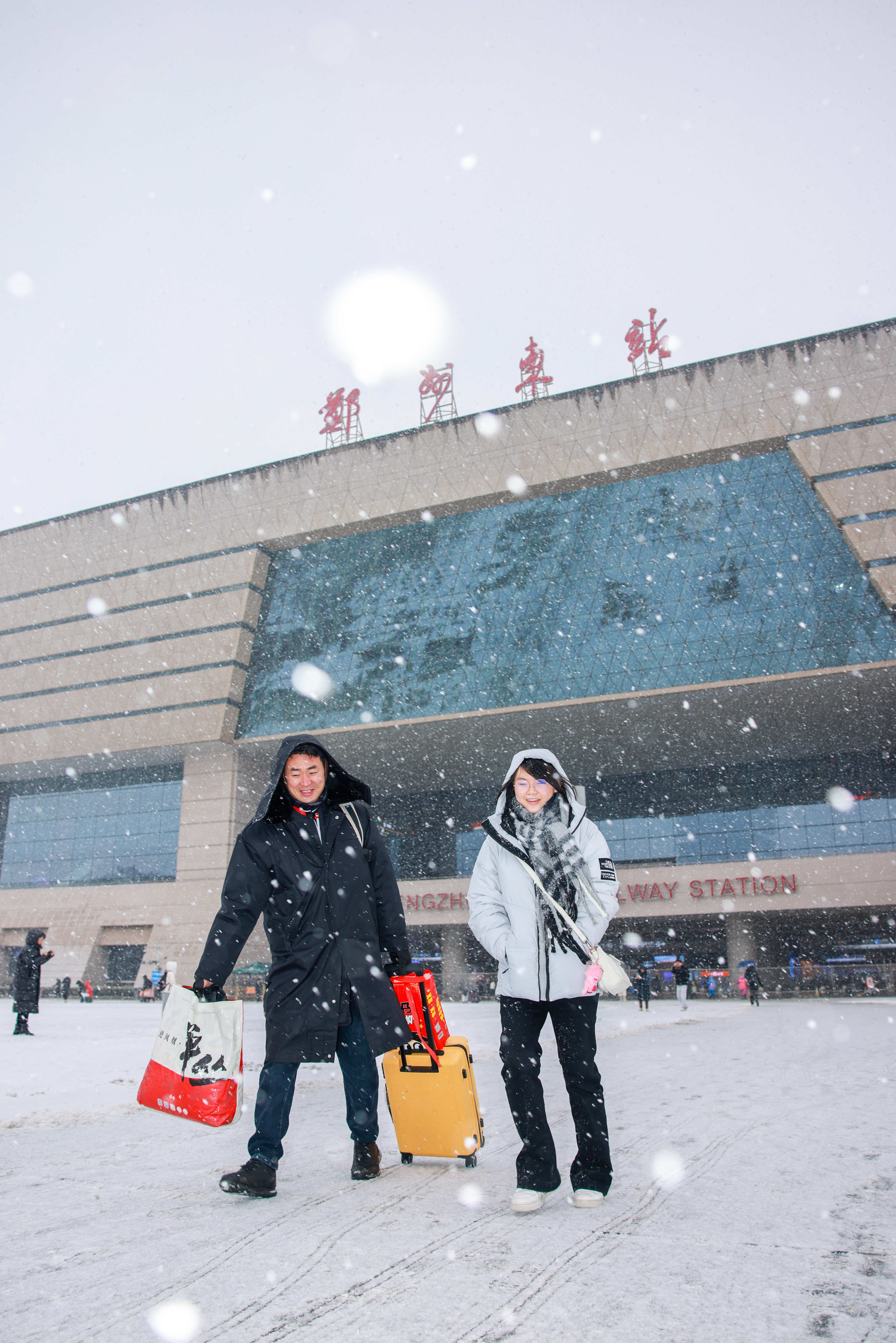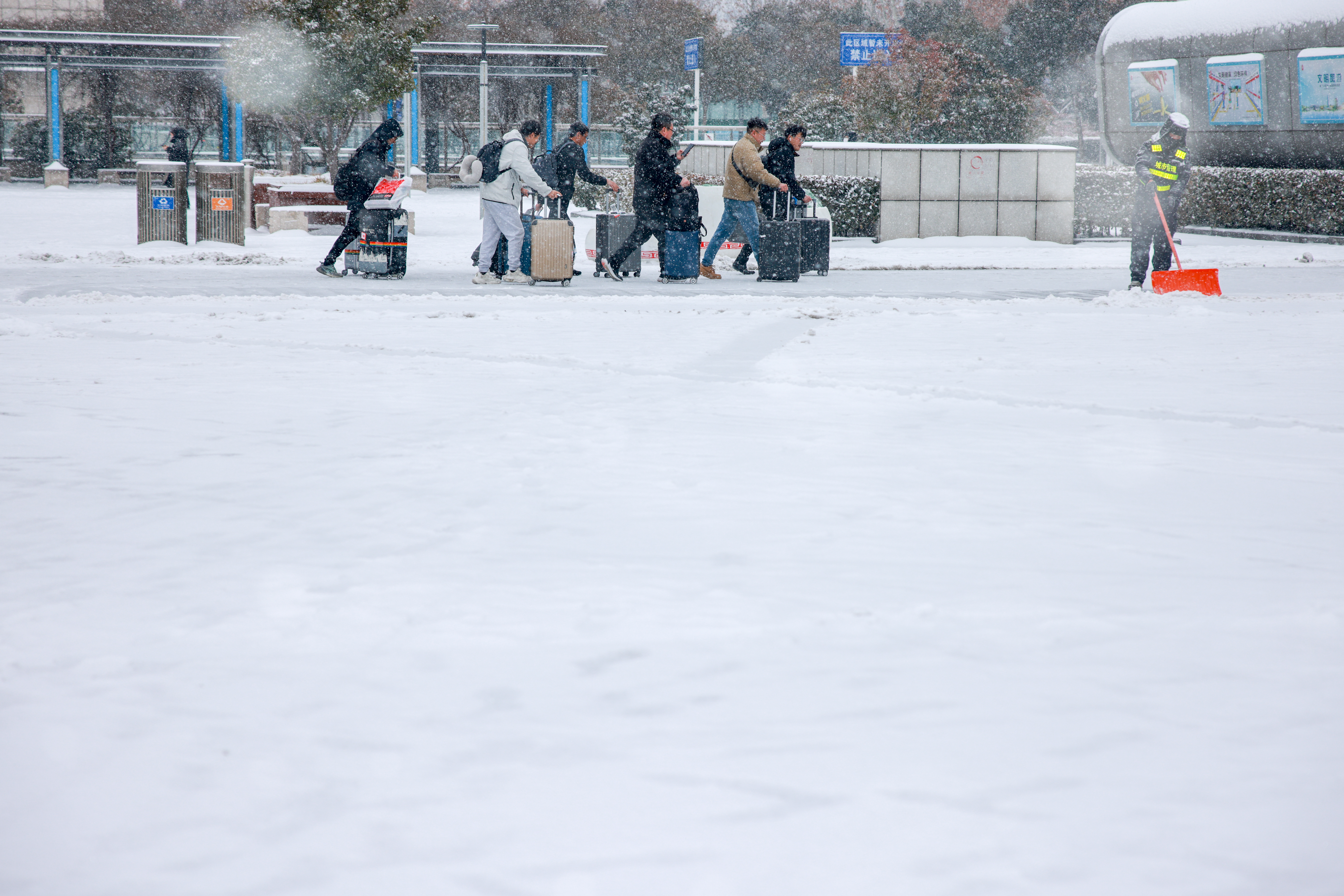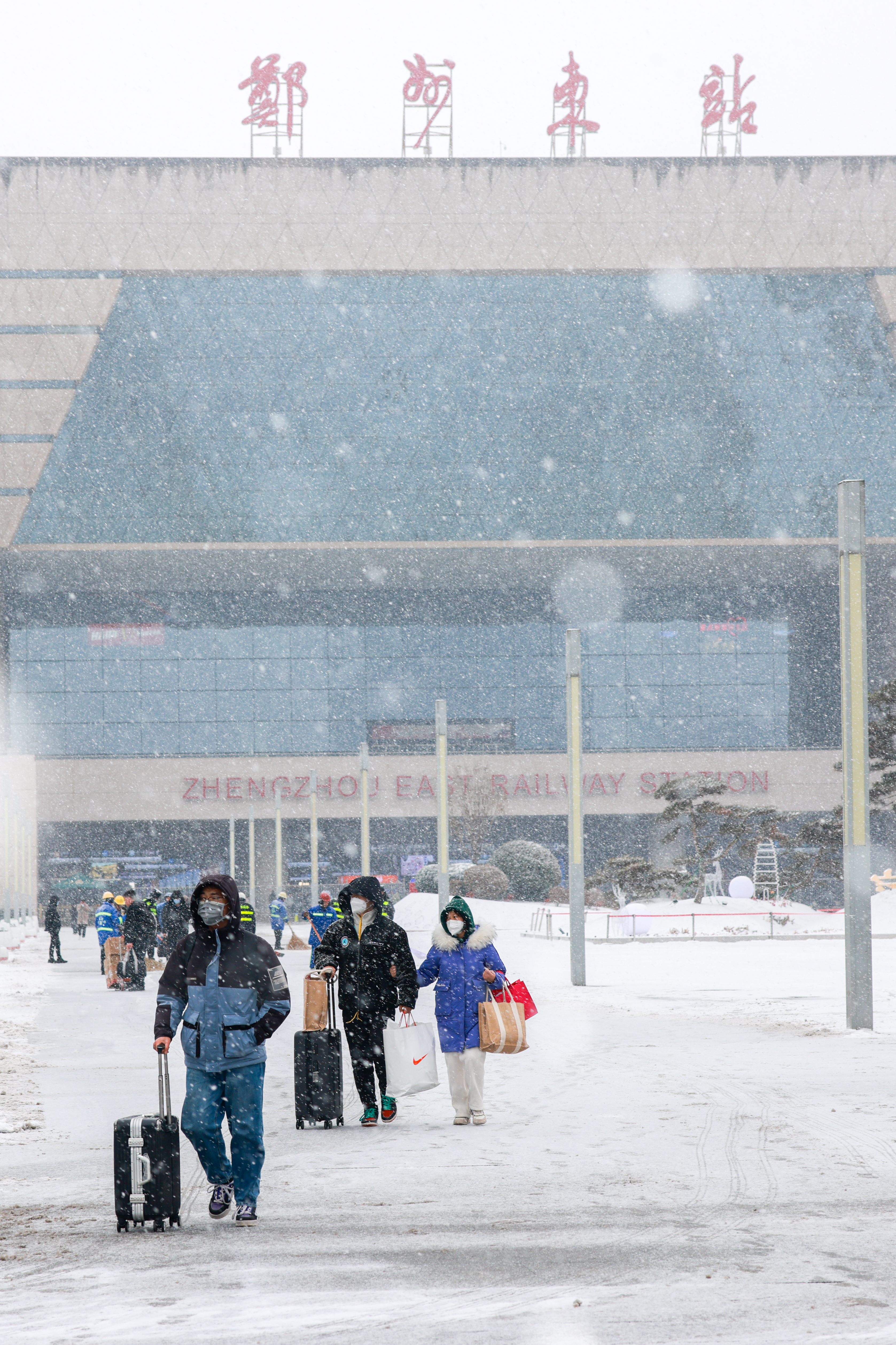 高铁站外大雪纷飞,旅客携带行李从高铁站走出。