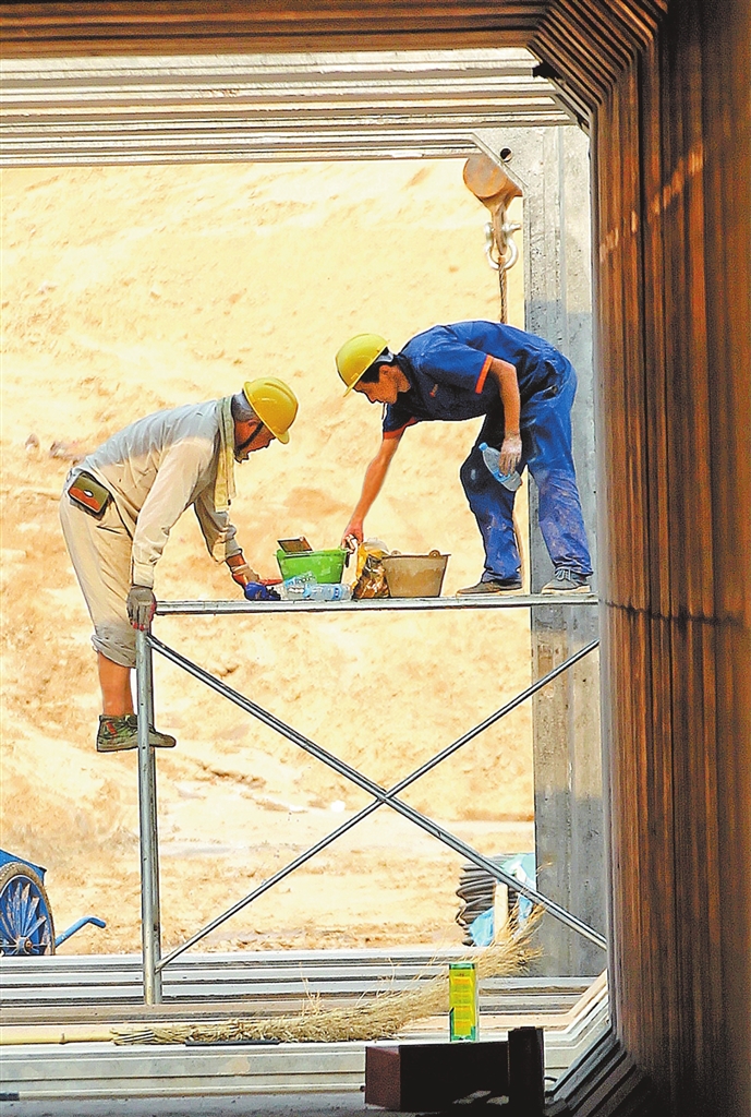6月12日,郑州市迎来高温天气,一建筑工地工人正在施工作业。该工地缩短施工人员作业时间,并设置凉棚,发放绿豆汤等防暑物品,帮助工人降温避暑。本报记者 邓放 摄