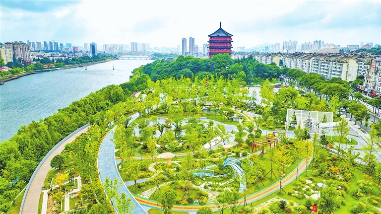 信阳浉河景观带风景如画(7月29日摄)。近年来,信阳市启动浉河景观带提升改造工程,改善了周边区域的城市景观面貌,使浉河真正实现河畅、水清、岸绿、景美,提升了人民群众的幸福感、获得感。 本报记者 聂冬晗 摄