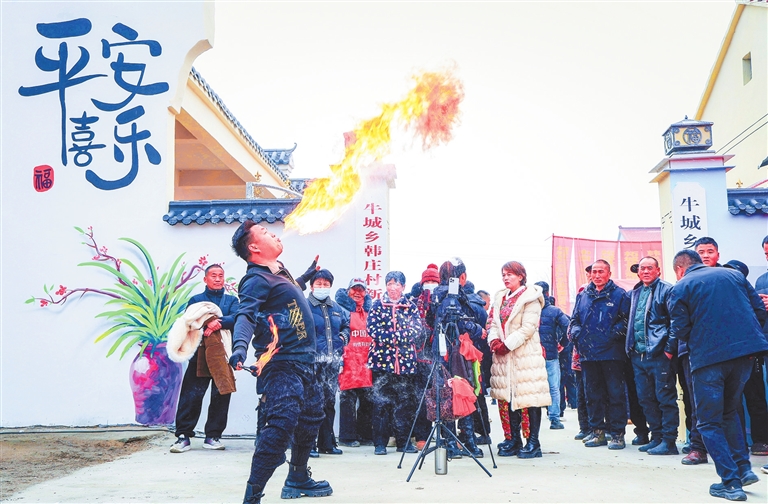 1月4日,柘城县牛城乡韩庄村孝善大食堂揭牌,街巷里欢声笑语,一场精彩的喷火表演更是将村民们的幸福与喜悦推向高潮。张书珲 摄